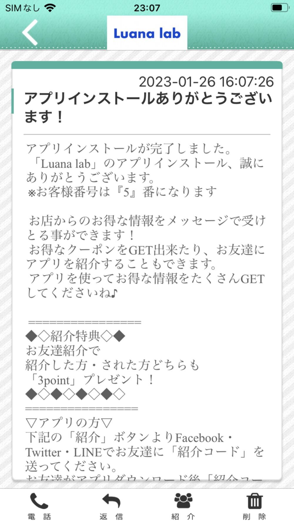 Luana labのアプリをSNSを通じてお友達に紹介する事ができます。