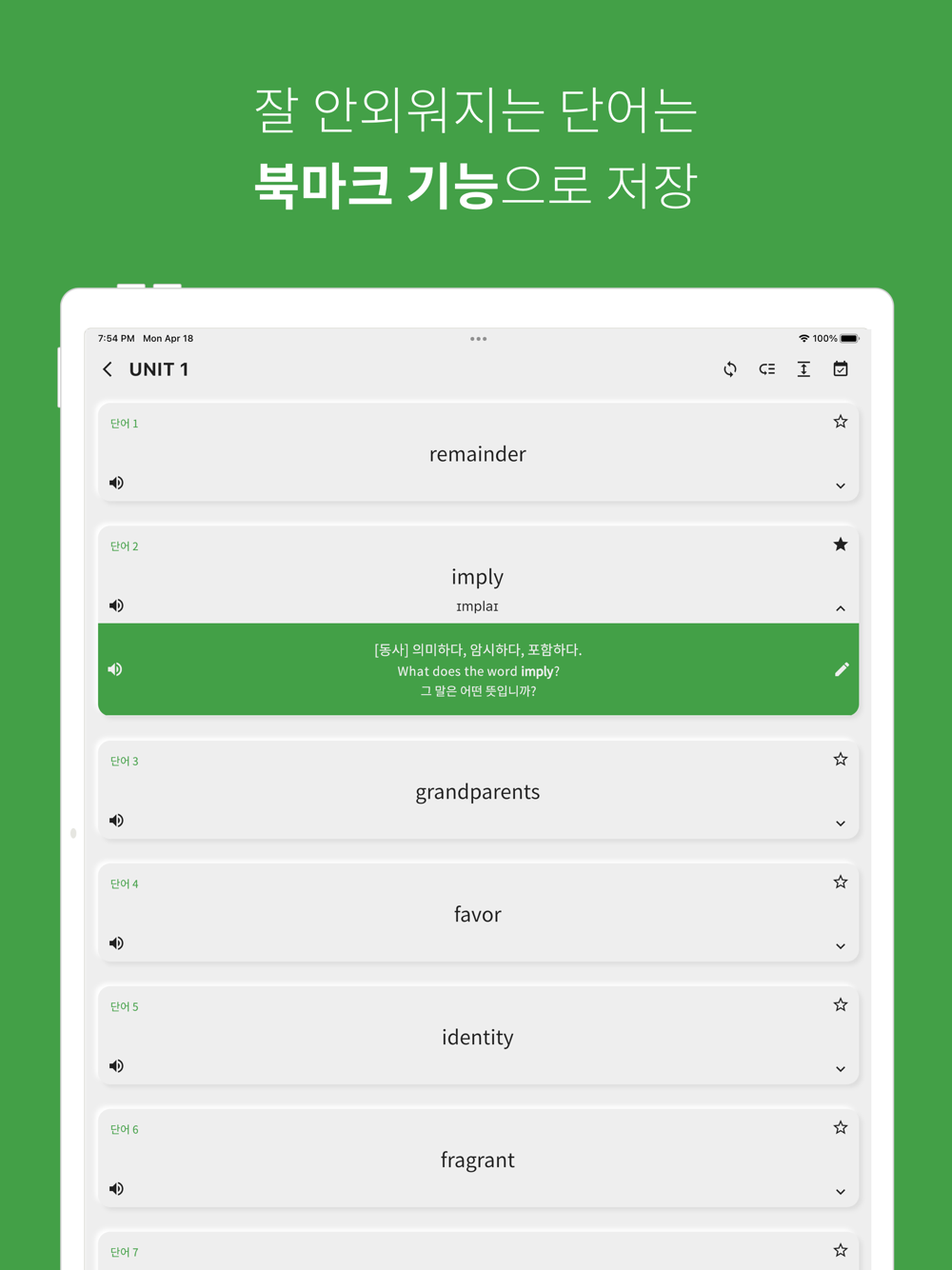 - 즐겨찾기: 암기가 잘 안되는 단어는 별 모양 버튼을 눌러 즐겨찾기에 추가할 수 있습니다.