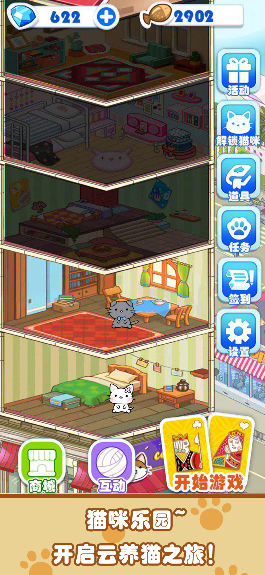 一个有超萌猫咪的公寓,您可以通过单机扑克小游戏闯关,解锁公寓里的更多猫咪品种;