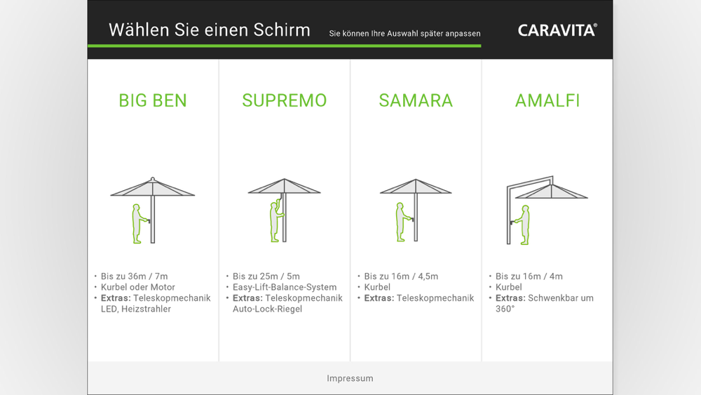 The CARAVITA AR Designer is your configurator for the virtual planning of your parasol. Using the Augmented Reality App, BIG BEN and Co. can be easily configured and visualised at your personal at your personal place of use.