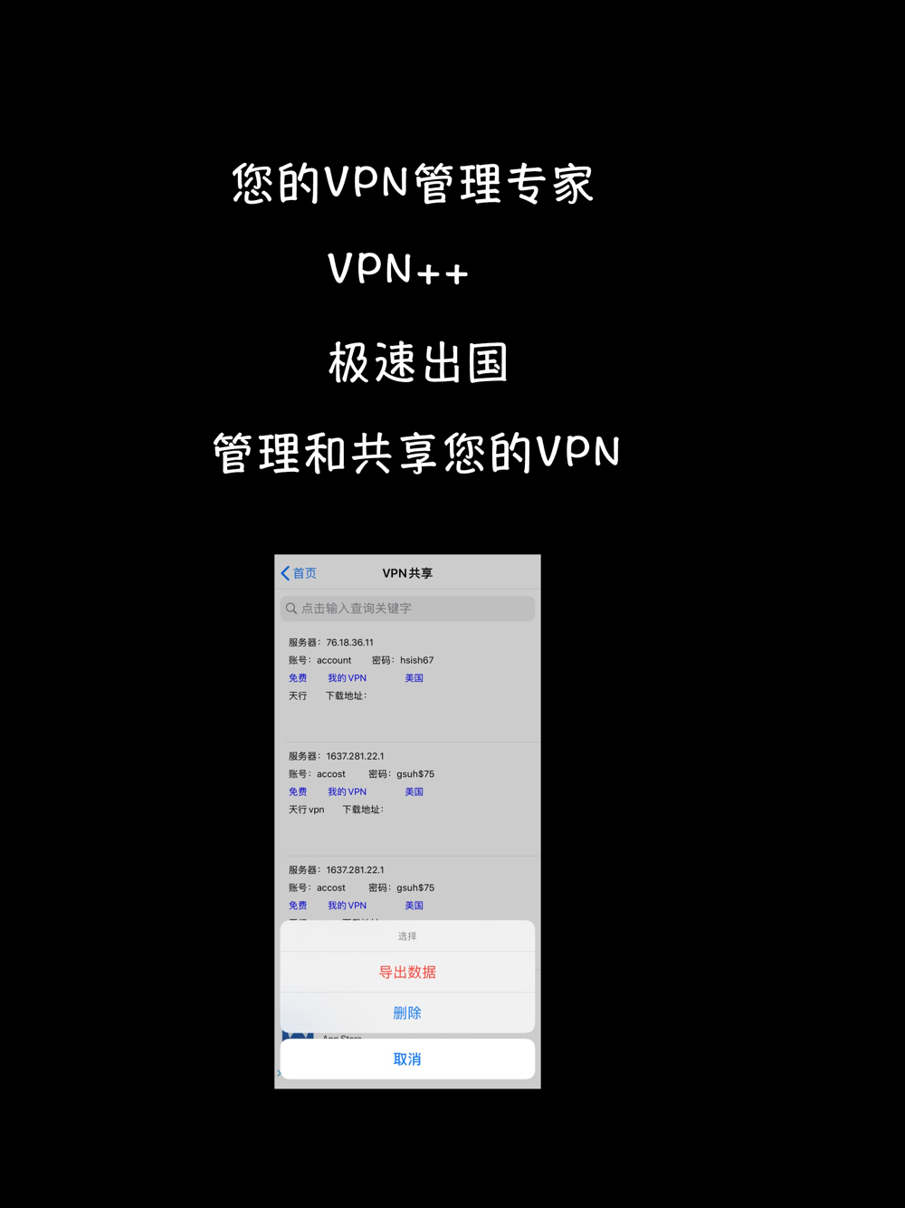 《VPN++》App是一款帮助大家管理VPN账号信息和共享VPN应用的工具软件,通过我们的App 您可以做以下几件事情: