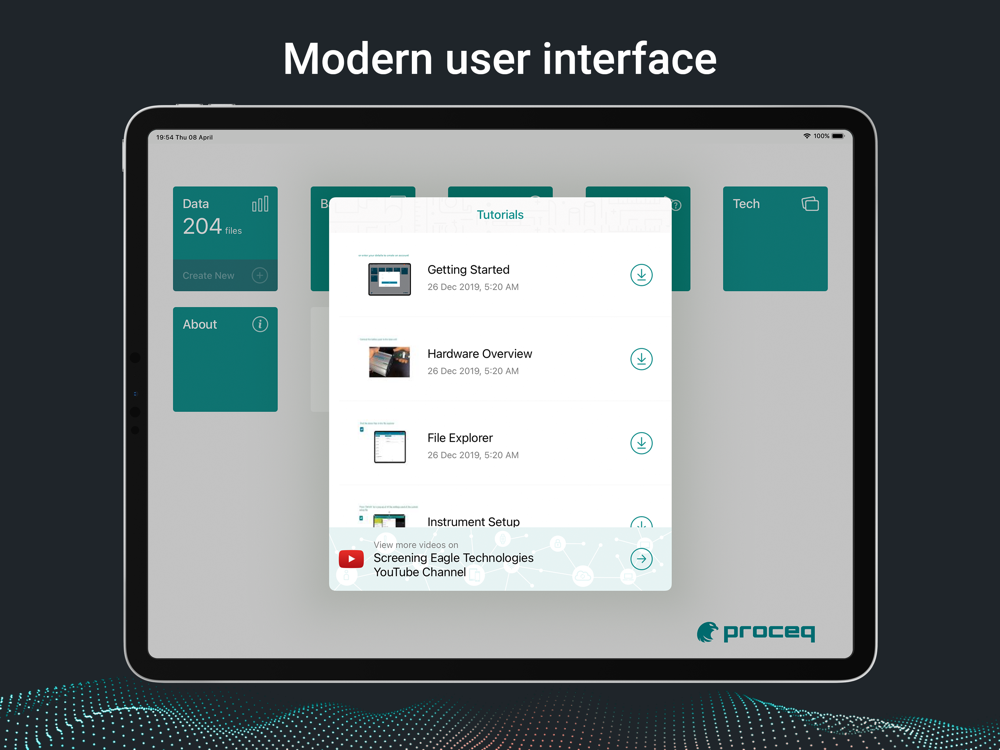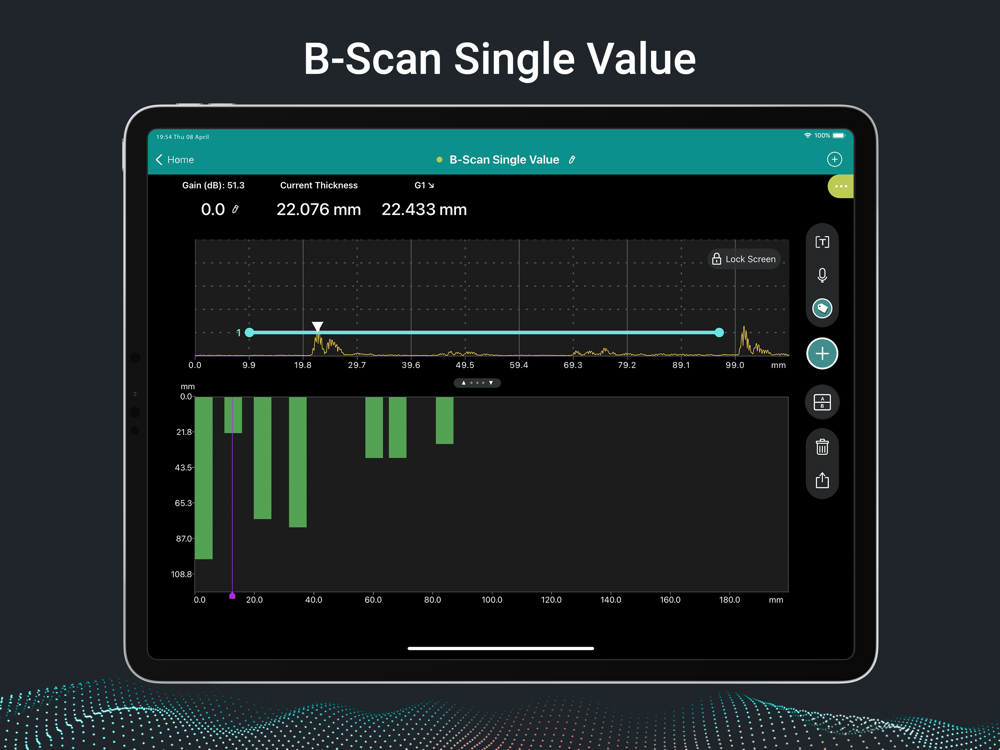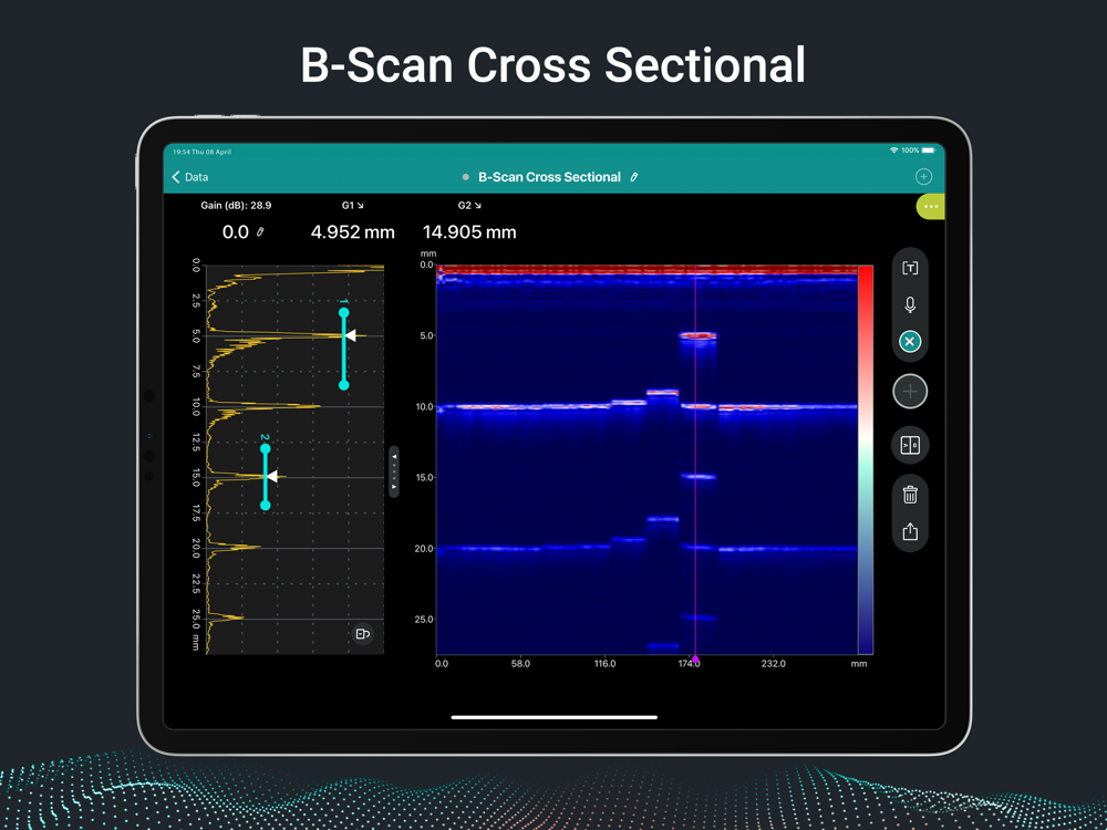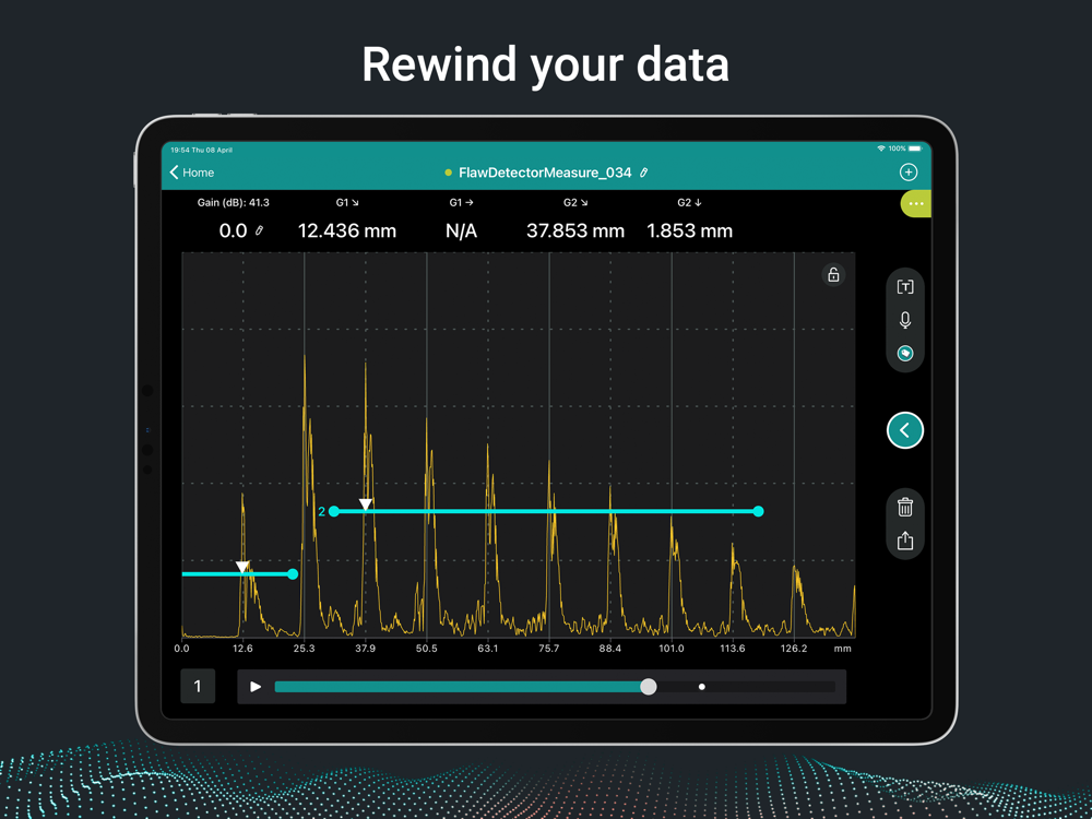 Connect the powerful base unit to your iPad and get to the real work faster. Our Proceq Flaw Detector Live app enhances your productivity with intelligent software features, such as the straightforward, gesture-driven calibration procedure, the built-in indication table, and the ability to rewind time for each indication.