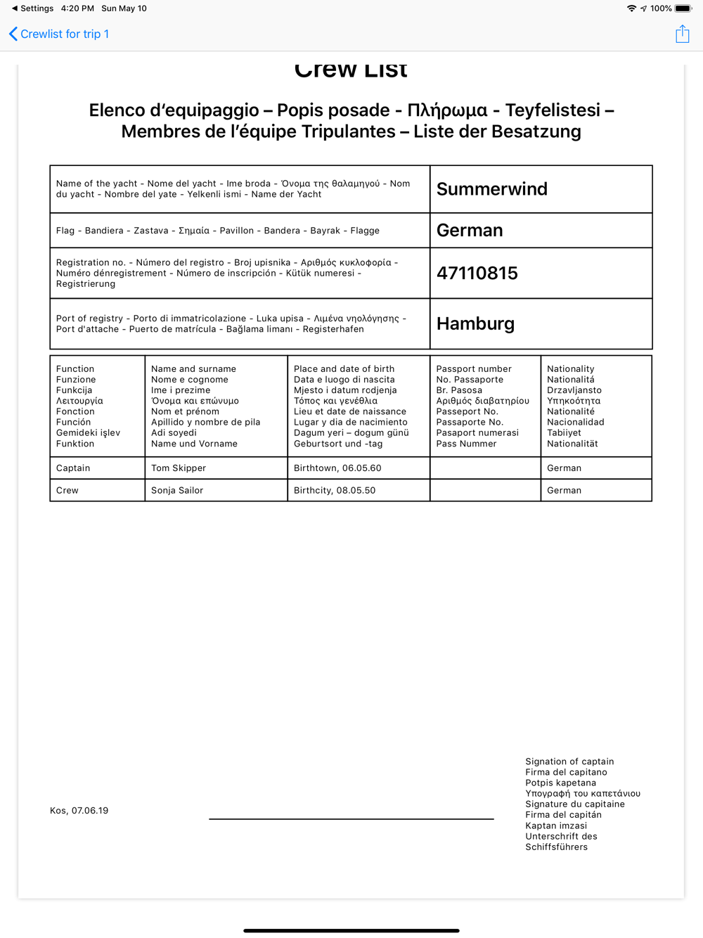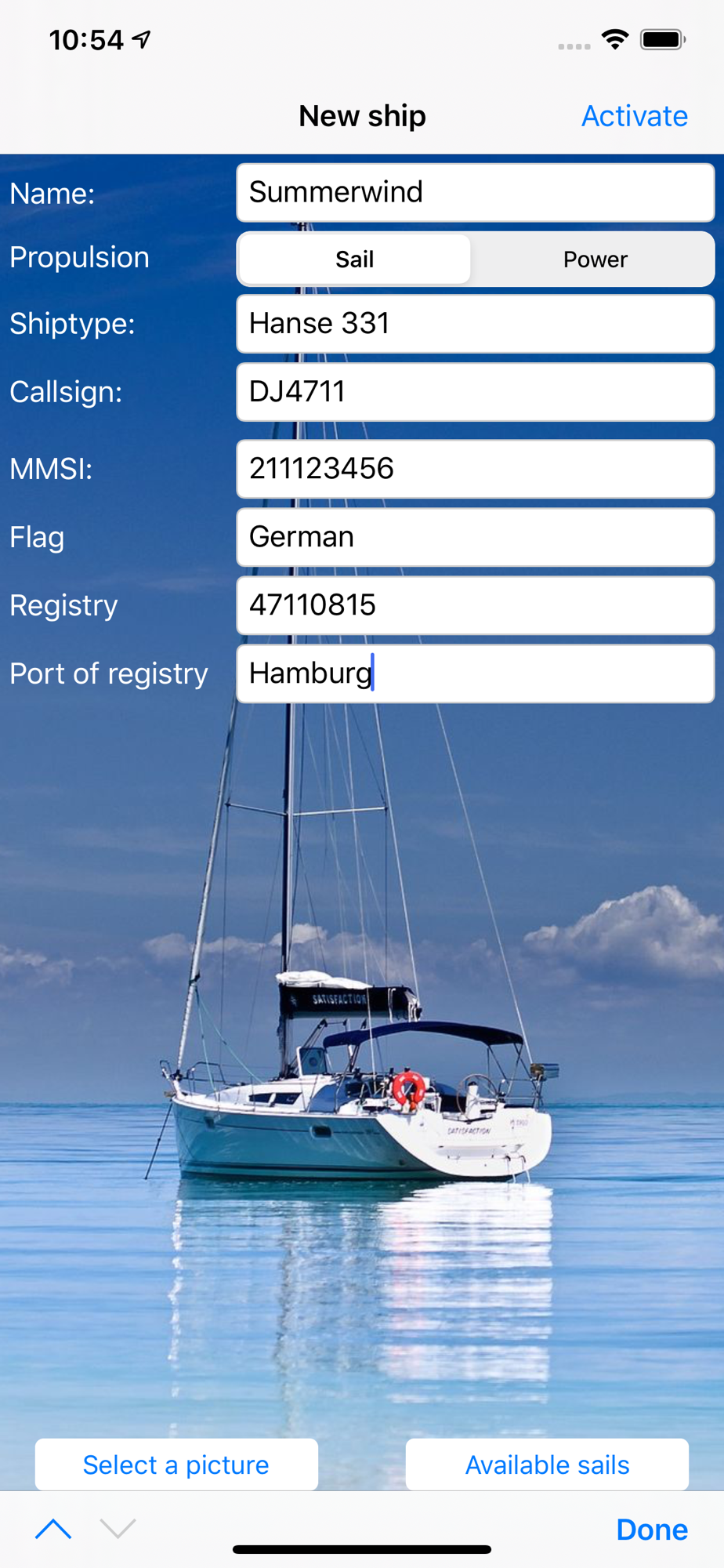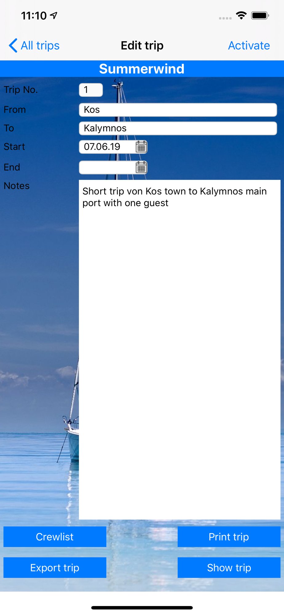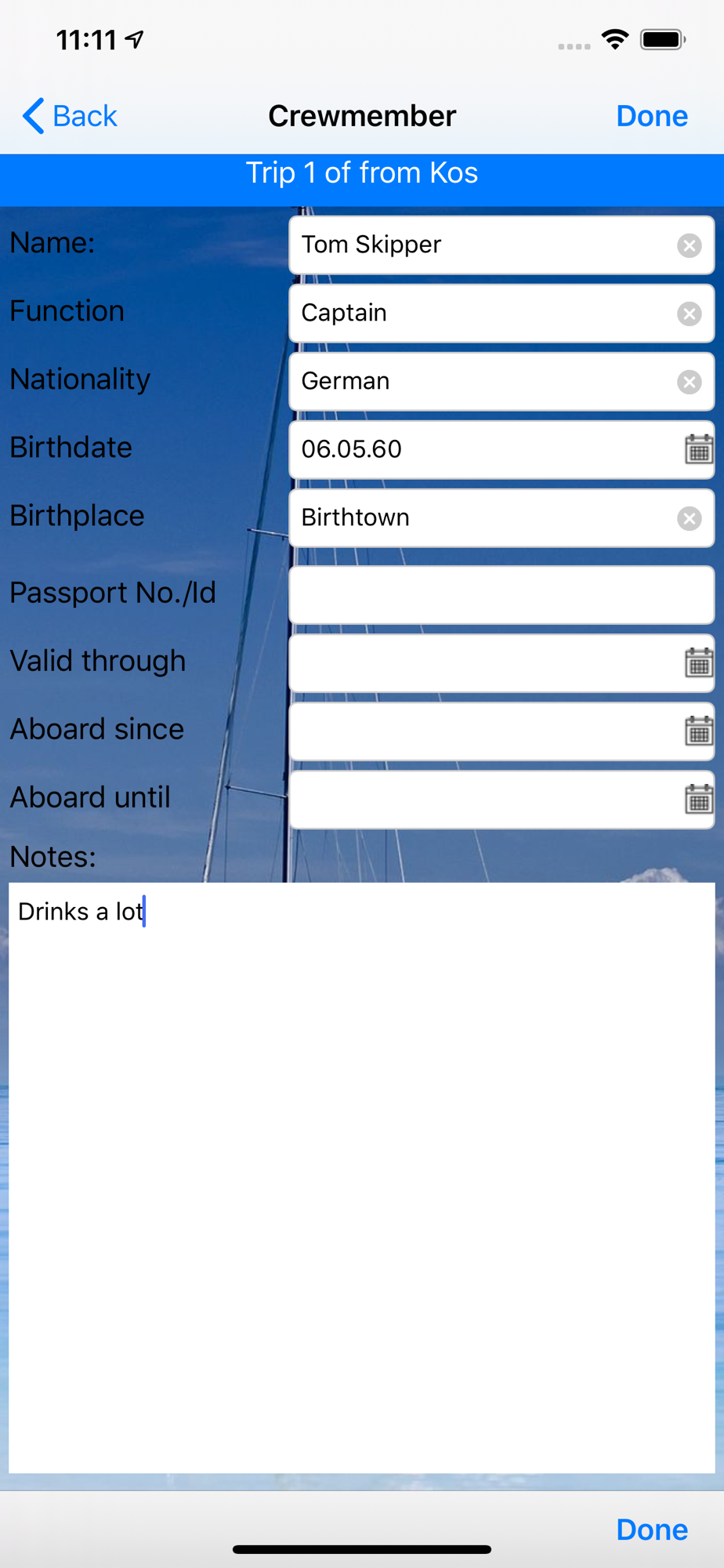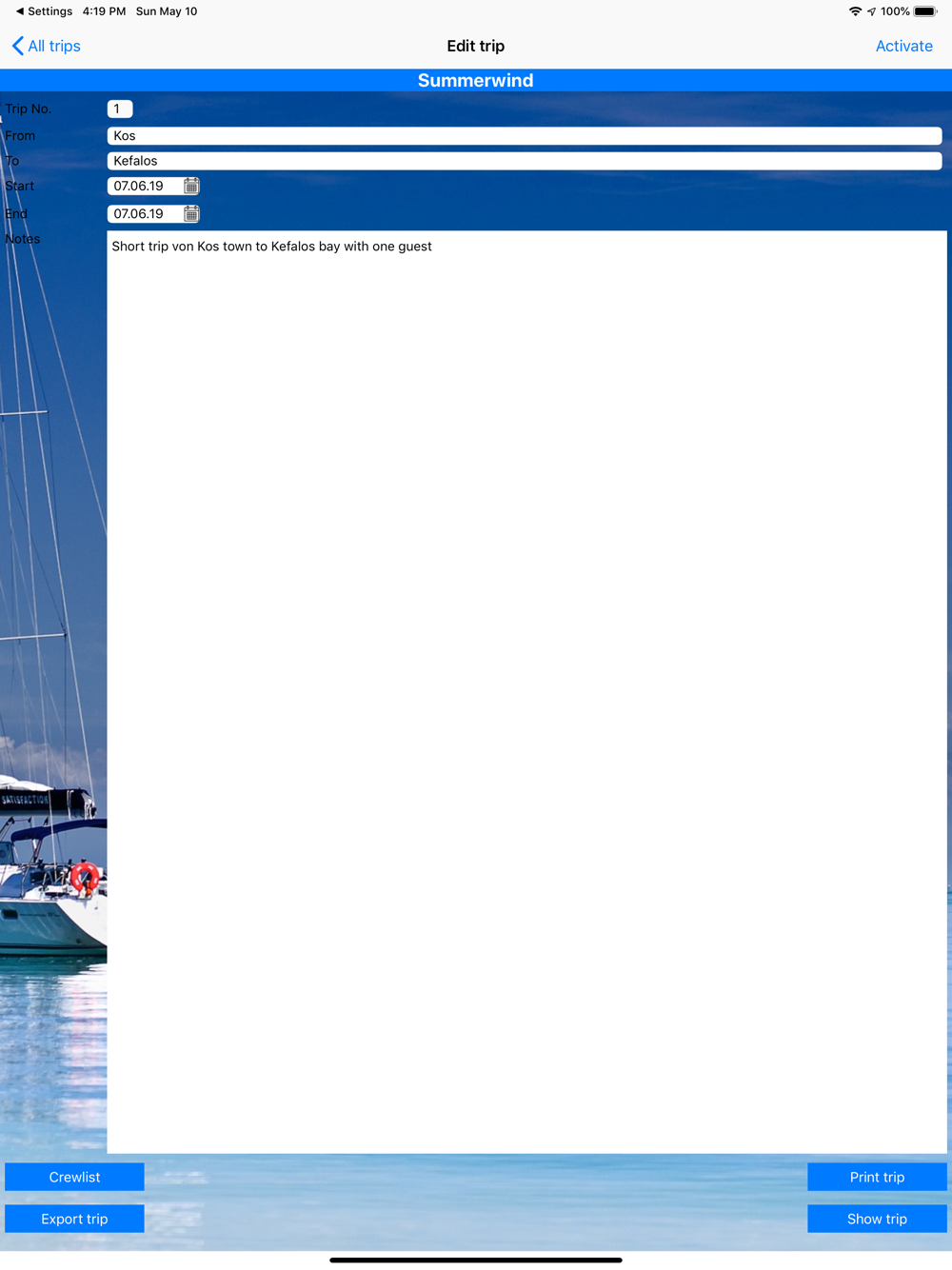 The free version of this app is limited to 1 ship, 1 trip and 40 manual log entries. Enough for a one or two week charter trip. No NMEA data are processed in the free app.