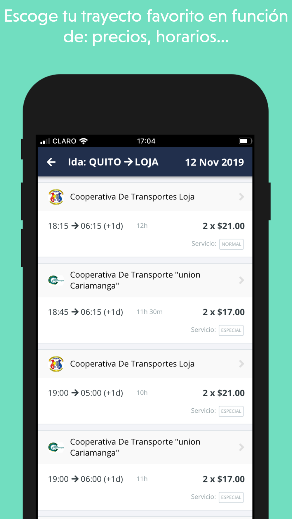 • Te brindamos el servicio de comprar directamente tus pasajes de bus para el Ecuador desde tu teléfono. Valoramos tu tiempo y no queremos que lo pierdas desplazándote a la Terminal Terrestre.