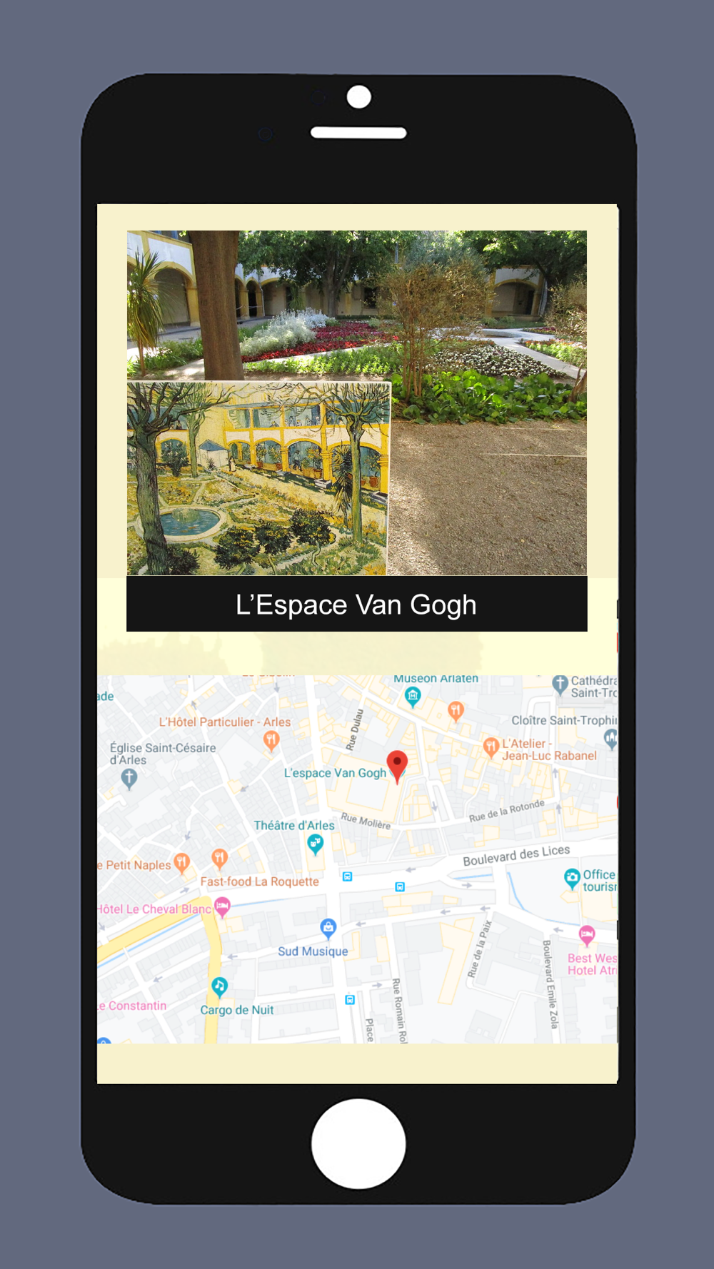 The 'Van Gogh in Arles' app reveals the story of the artist as you move from location to location in the marvelous city of Arles. It uses your device's GPS to guide you and to present audio, text and Van Gogh's letters and paintings matched to your location.