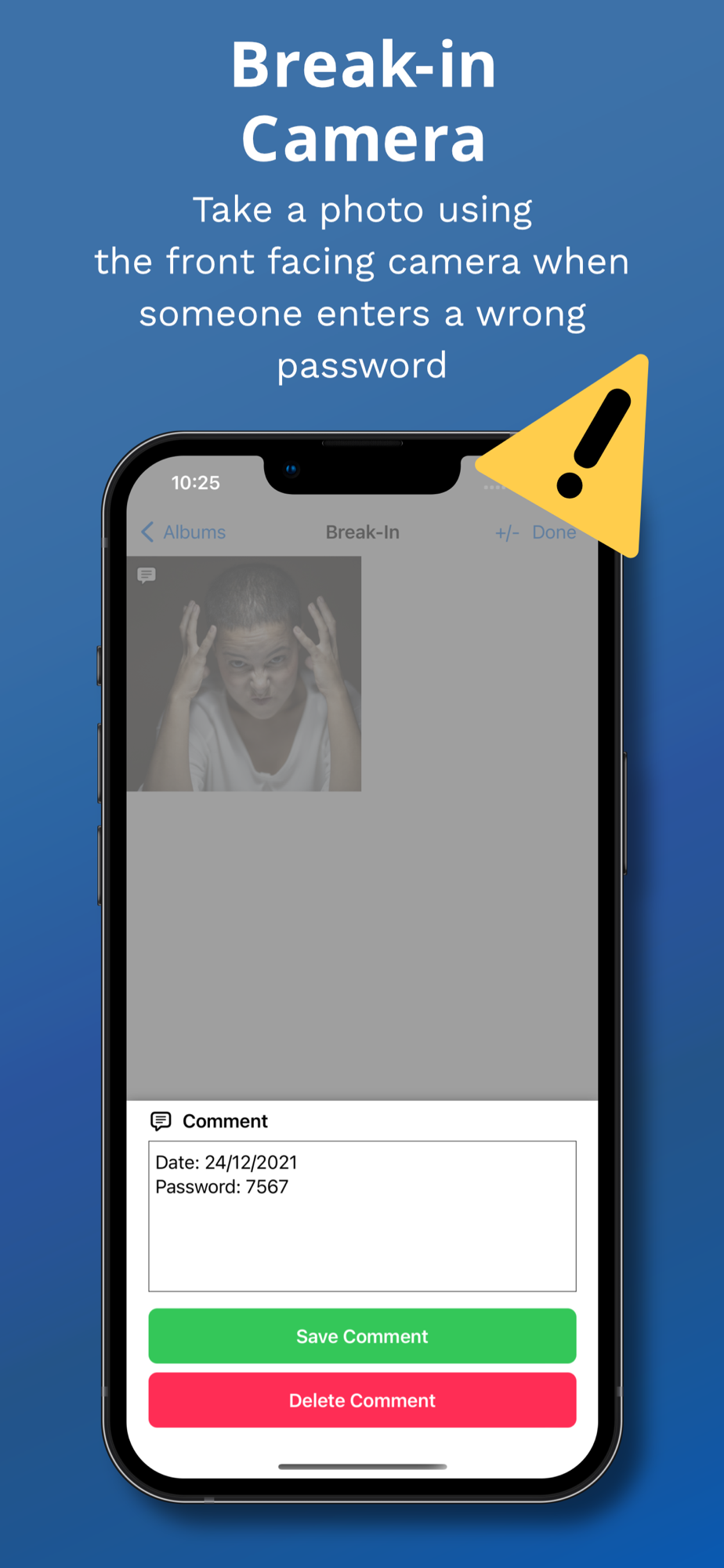 An exclusive break-in feature which will take a picture of anyone who tries to open the app by typing a wrong password! The photo will be stored automatically in a break-in album in the app.