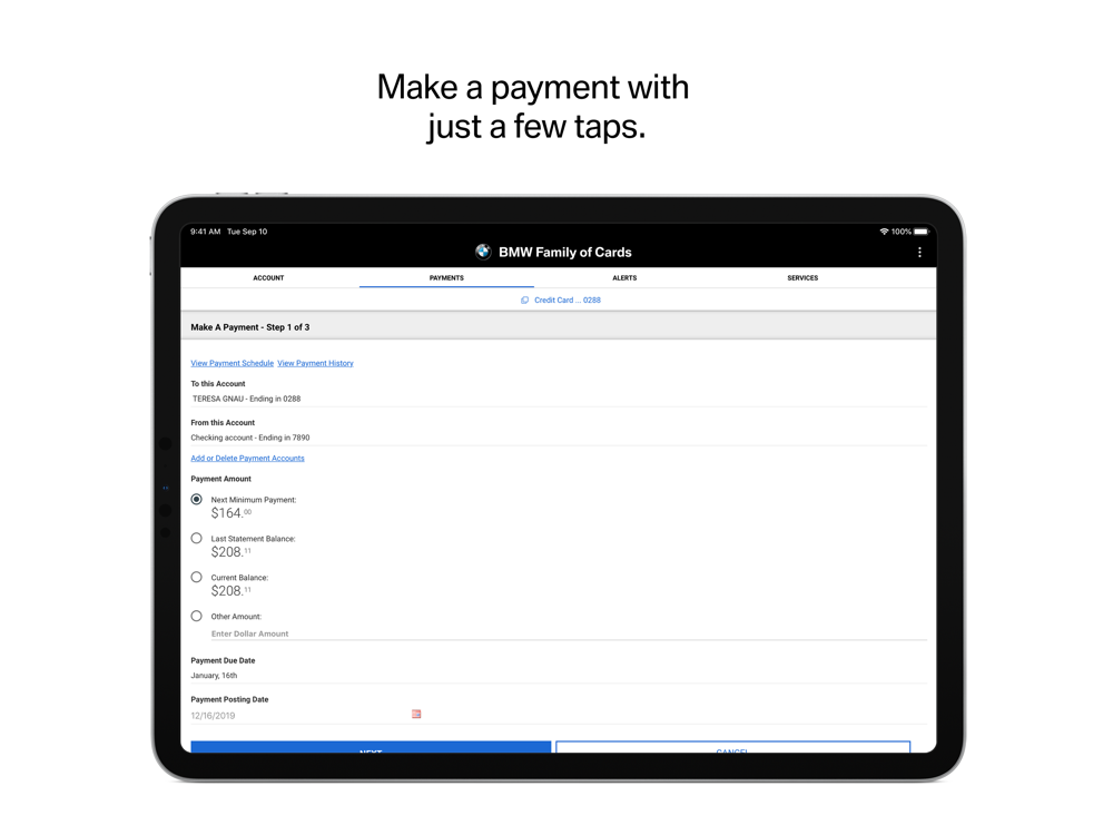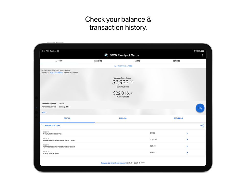 You can manage your BMW credit card conveniently and securely from anywhere, using the BMW Family of Cards Mobile App. Check your account balance, view account info, make payments, redeem rewards, and more!