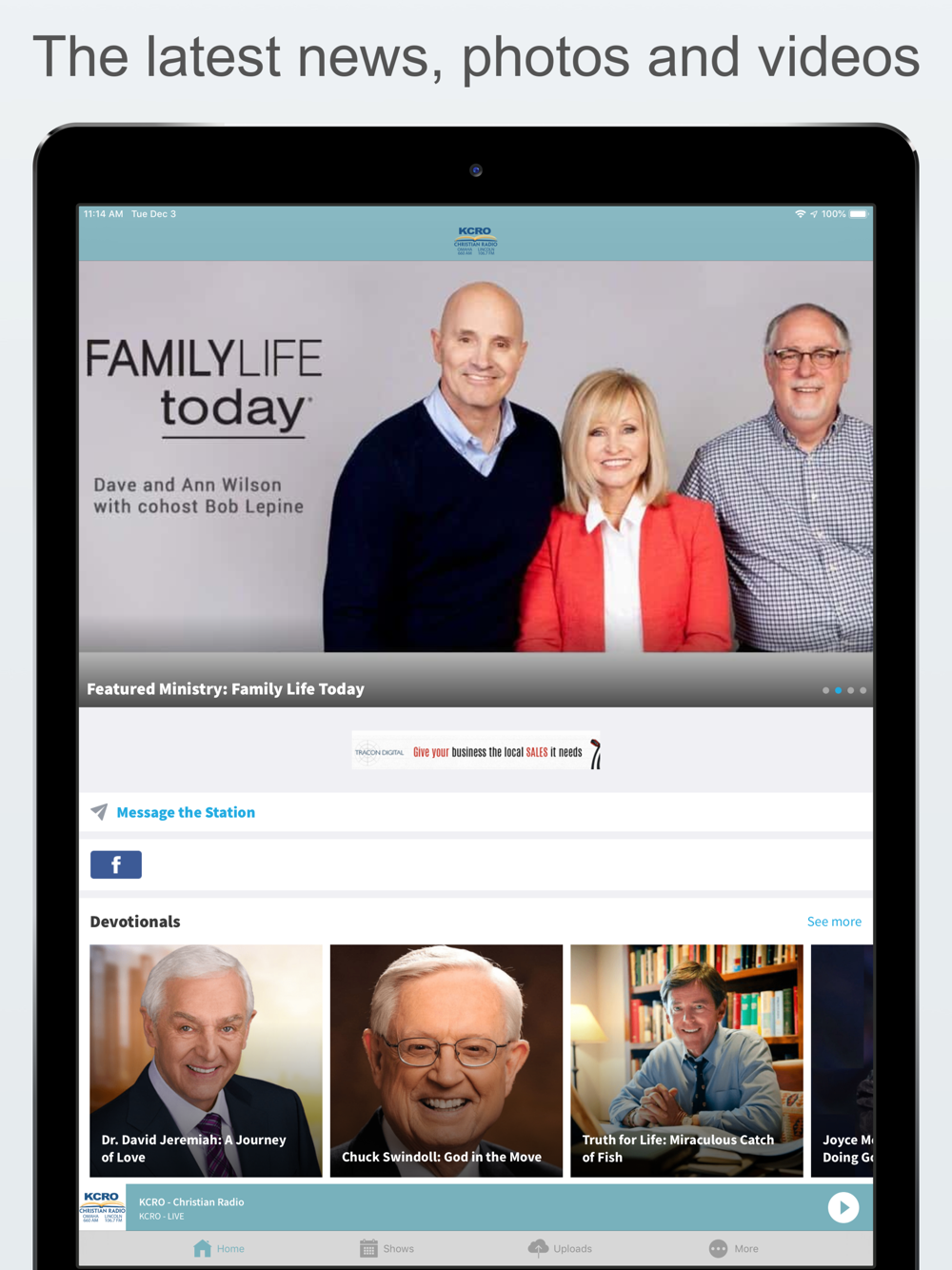 Celebrating 40 years of broadcasting Christian programming, KCRO is eastern Nebraska’s and western Iowa’s premier Christian radio station. KCRO features local and national Christian talk programs designed to encourage and build your faith in Christ. Programming includes: Grace Bible Church Truth for Life Focus on the Family Family Life Today Thru the Bible Enjoying Everyday Life Insight for Living Turning Point New Life Live The Narrow Path Adventures in Odyssey
