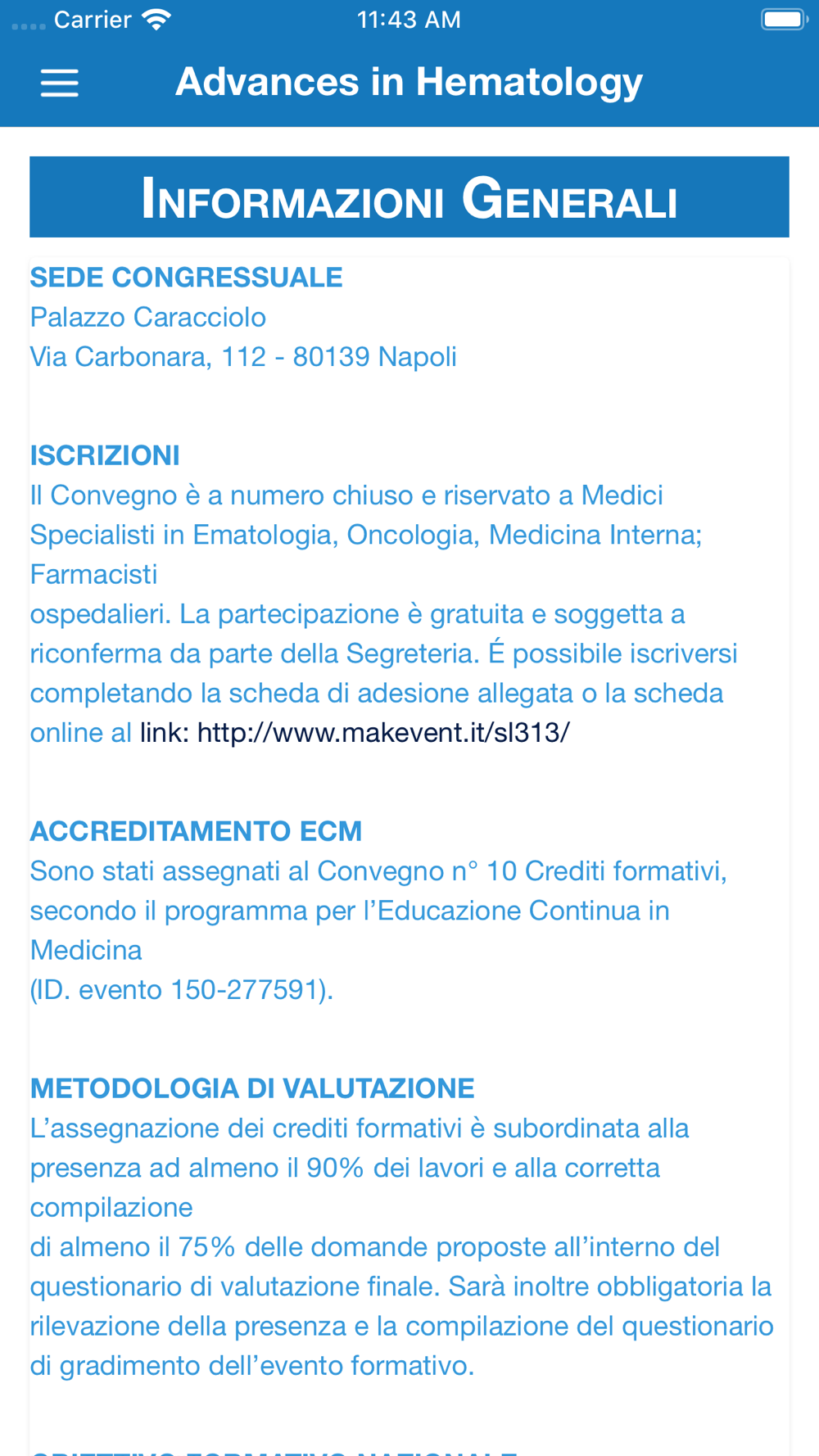 La App è stata realizzata appositamente per il 1° Convegno nazionale Advances in Hematology Il ruolo dei TKI di terza generazione, che si terrà a Napoli in data 16-17 dicembre 2019. Riservata ai partecipanti all’evento e accessibile solo tramite credenziali personalizzate, permetterà agli iscritti di interagire con la manifestazione in tutte le sue fasi.