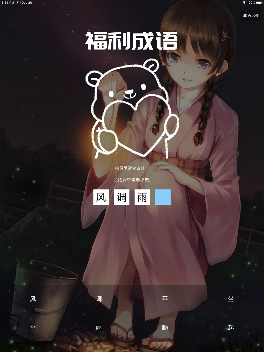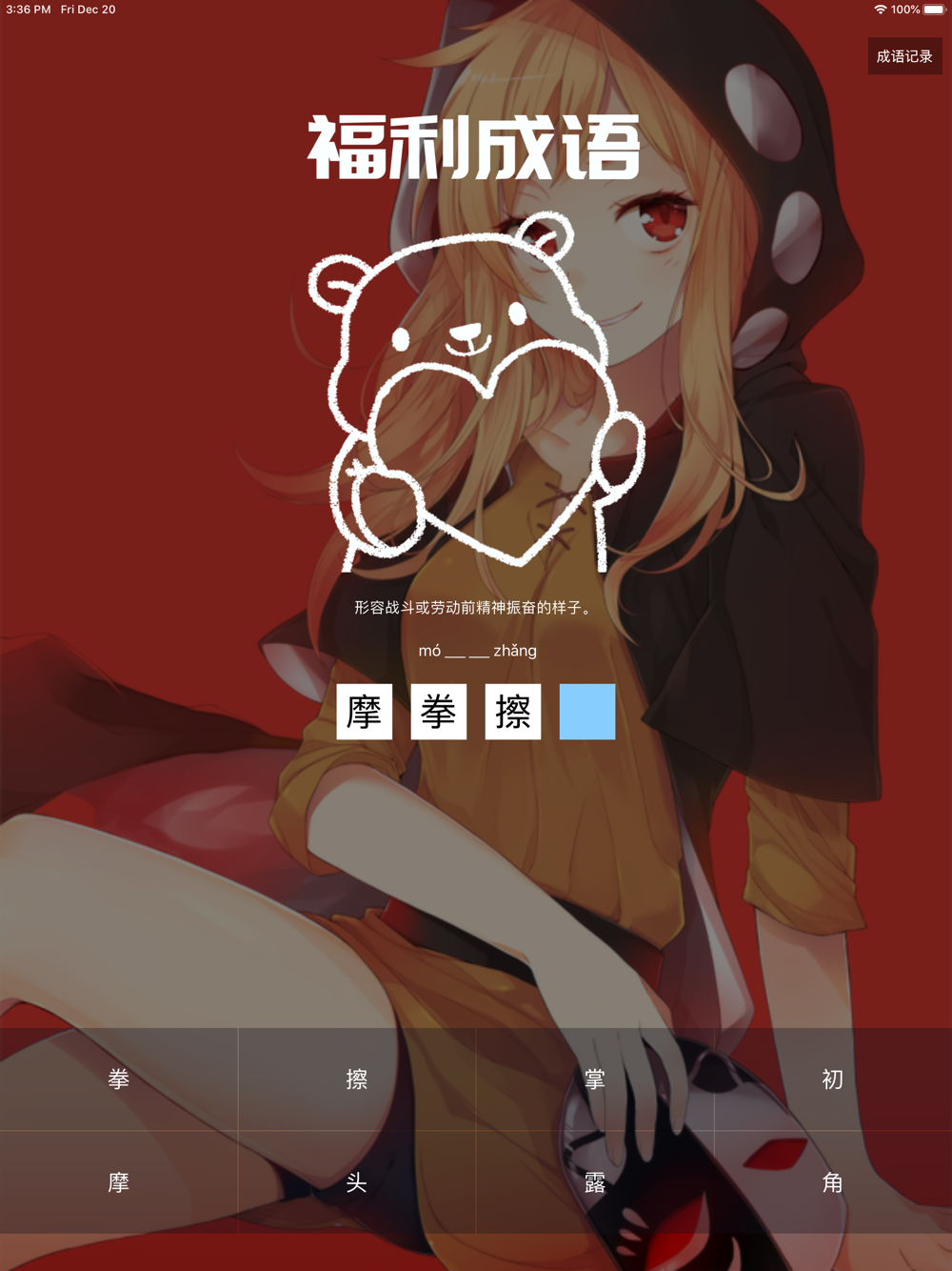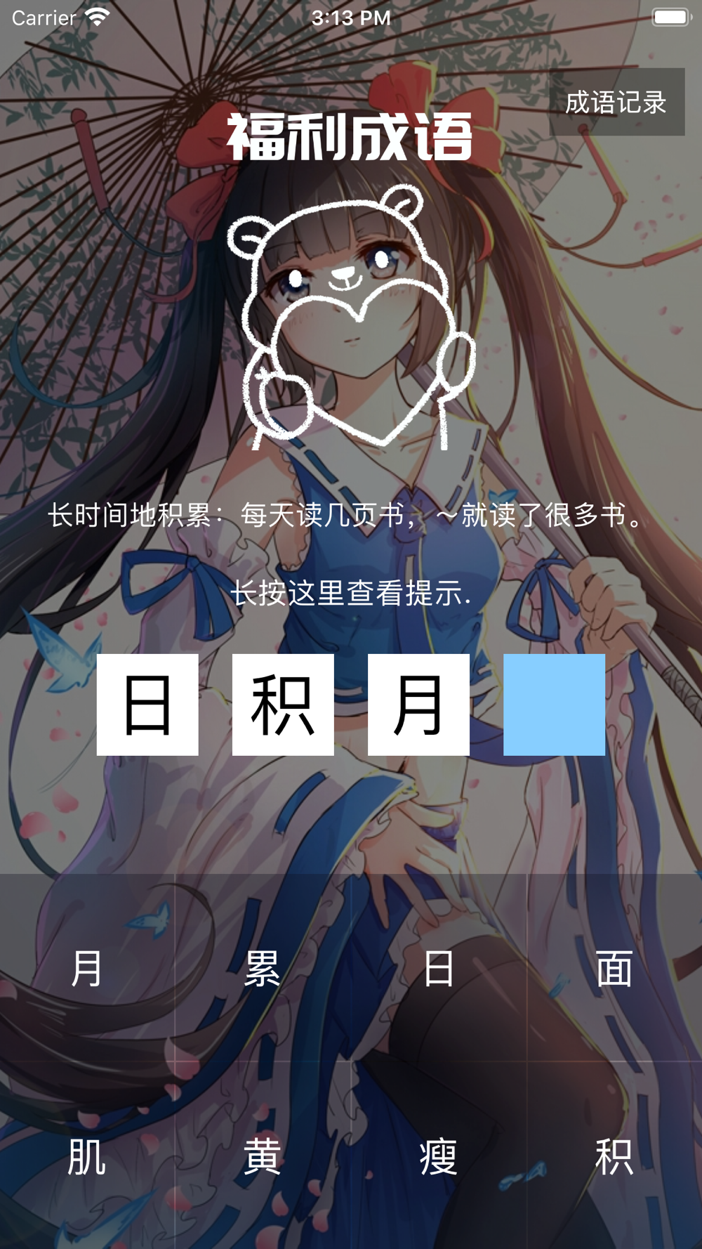 这是一款非常有趣的成语记忆工具,为用户提供了海量的成语,用户回答对一个成语就会有各种好看的二次元的图片显示出来。