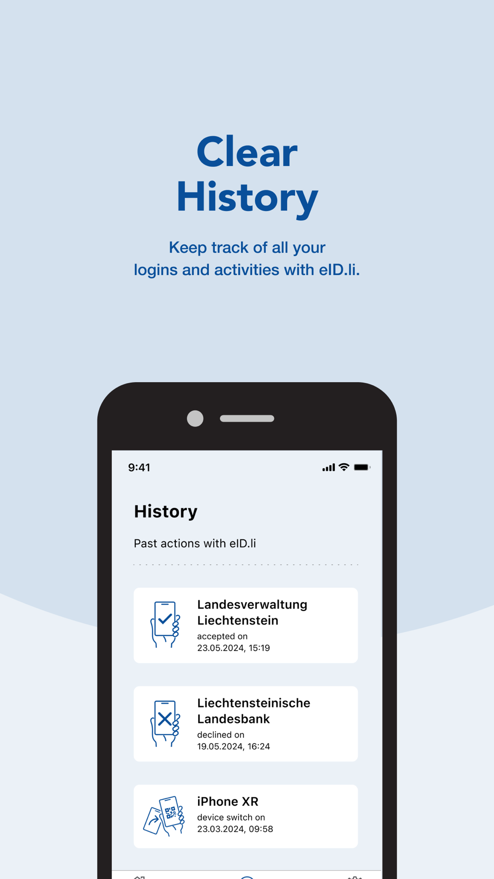 Stay on track and in control about your online activities with the ”history” section of eID.li.