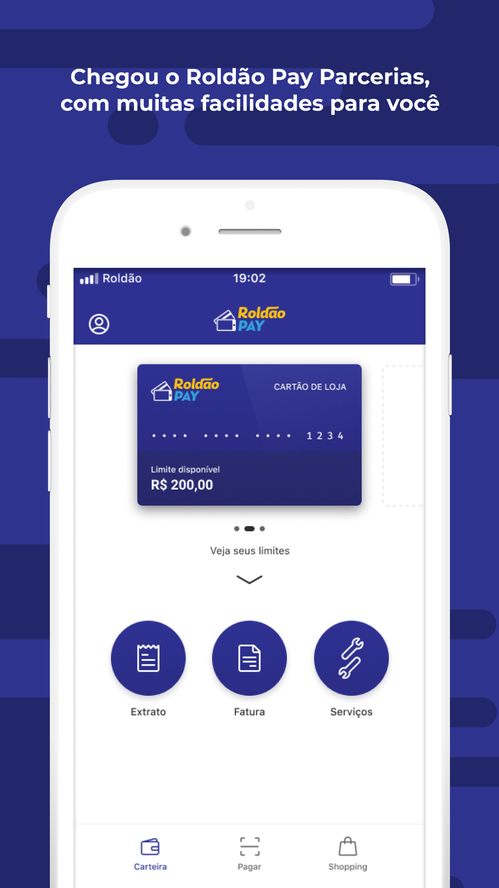Com o seu aplicativo Roldão Pago você pode utilizar seu Cartão Roldão Pay para ter acesso a diversos benefícios como chamar um motorista por aplicativo, pedir comida, recarregar seu celular e pagar compras em lojas parceiras.