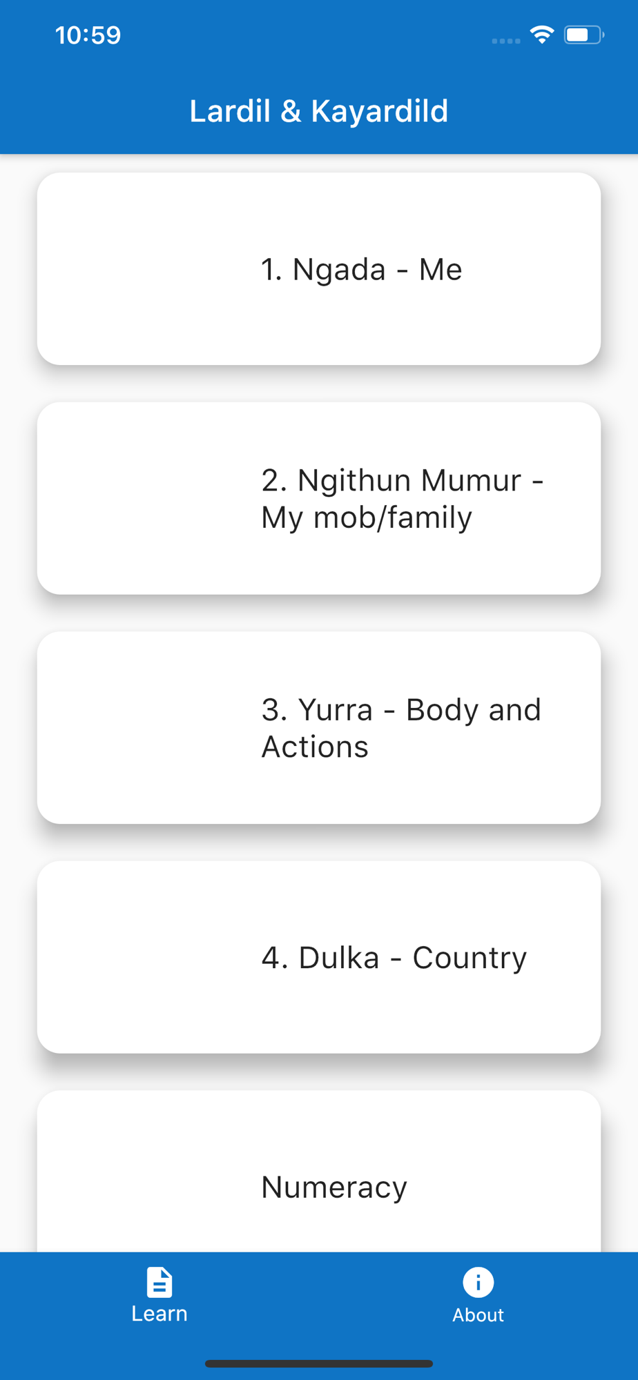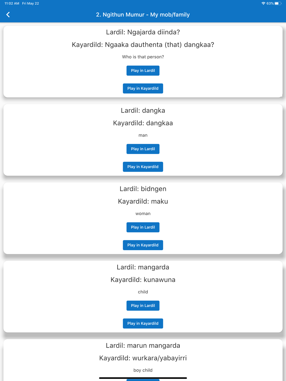 This app has been developed to support the teaching and learning of the Lardil and Kayardild languages of the Wellesley Islands in the Gulf of Carpentaria, Australia at Mornington Island State School. The content of the app is produced in partnership with the Mornington Island State School and the Lardil and Kayardild Language Advisory Group.