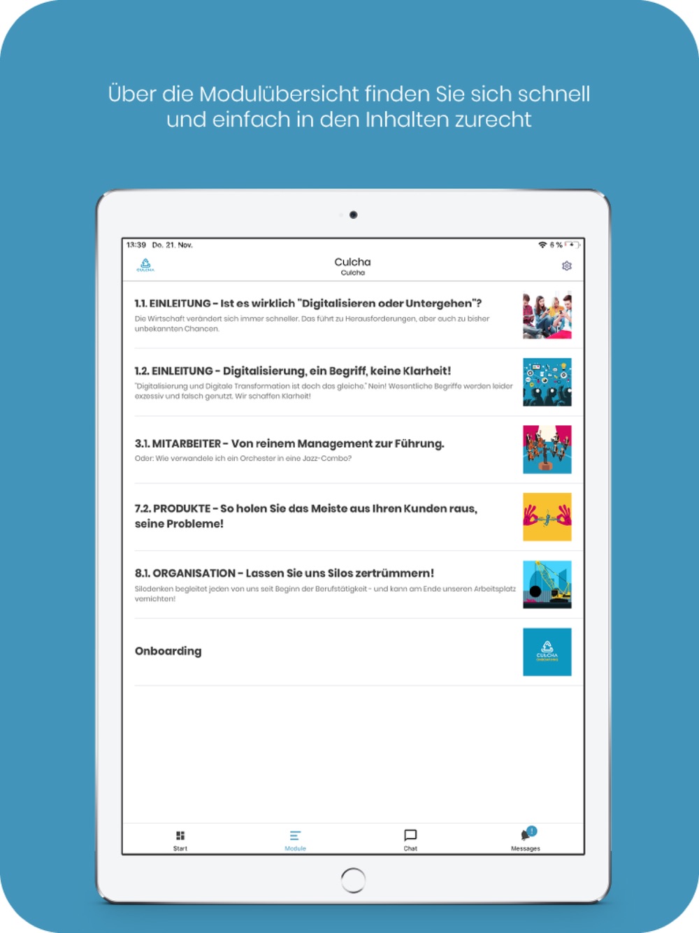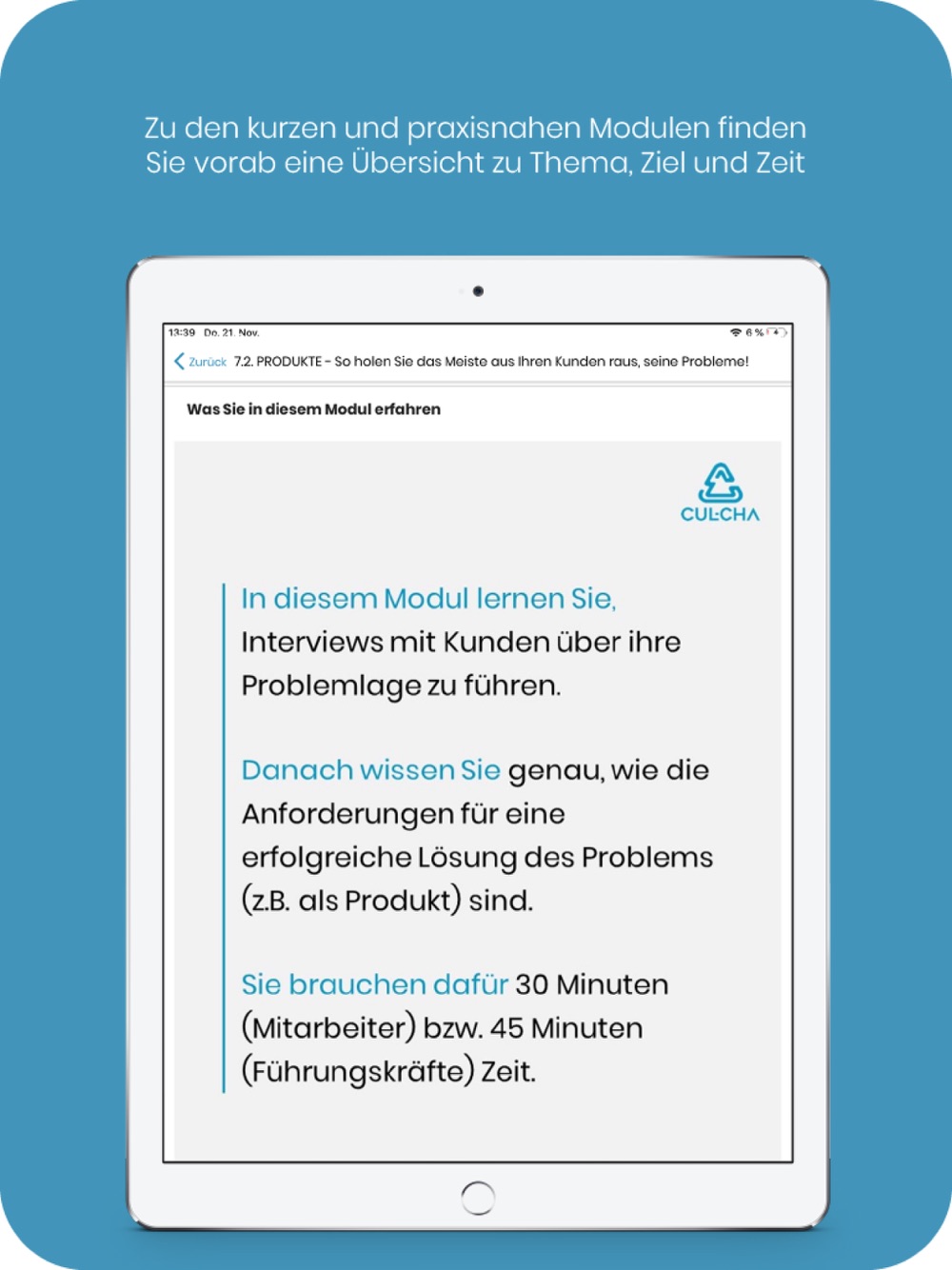 Change Maßnahmen versanden häufig. Nicht mit Culcha, denn Culcha vermittelt nötiges Wissen und stellt dazu sicher, dass es auch im Arbeitsalltag angewendet wird. Das gelingt mit leicht aufzunehmenden Wissenseinheiten in Text, Grafik, Audio und Video, gemischt mit lustigen Gifs und abgerundet mit sehr konkreten Checklisten. Dazu kommt für Führungskräfte die Möglichkeit, neue Verhaltensweisen auszuwählen, die sie in ihrer Führungsarbeit umsetzen wollen. Und Culcha hilft ihnen dabei – durch Erinnerungen, Reflexionen, Fortschrittsberichte und Motivation. So wird Culcha zu einem Spickzettel für Führung im Digitalen Zeitalter.