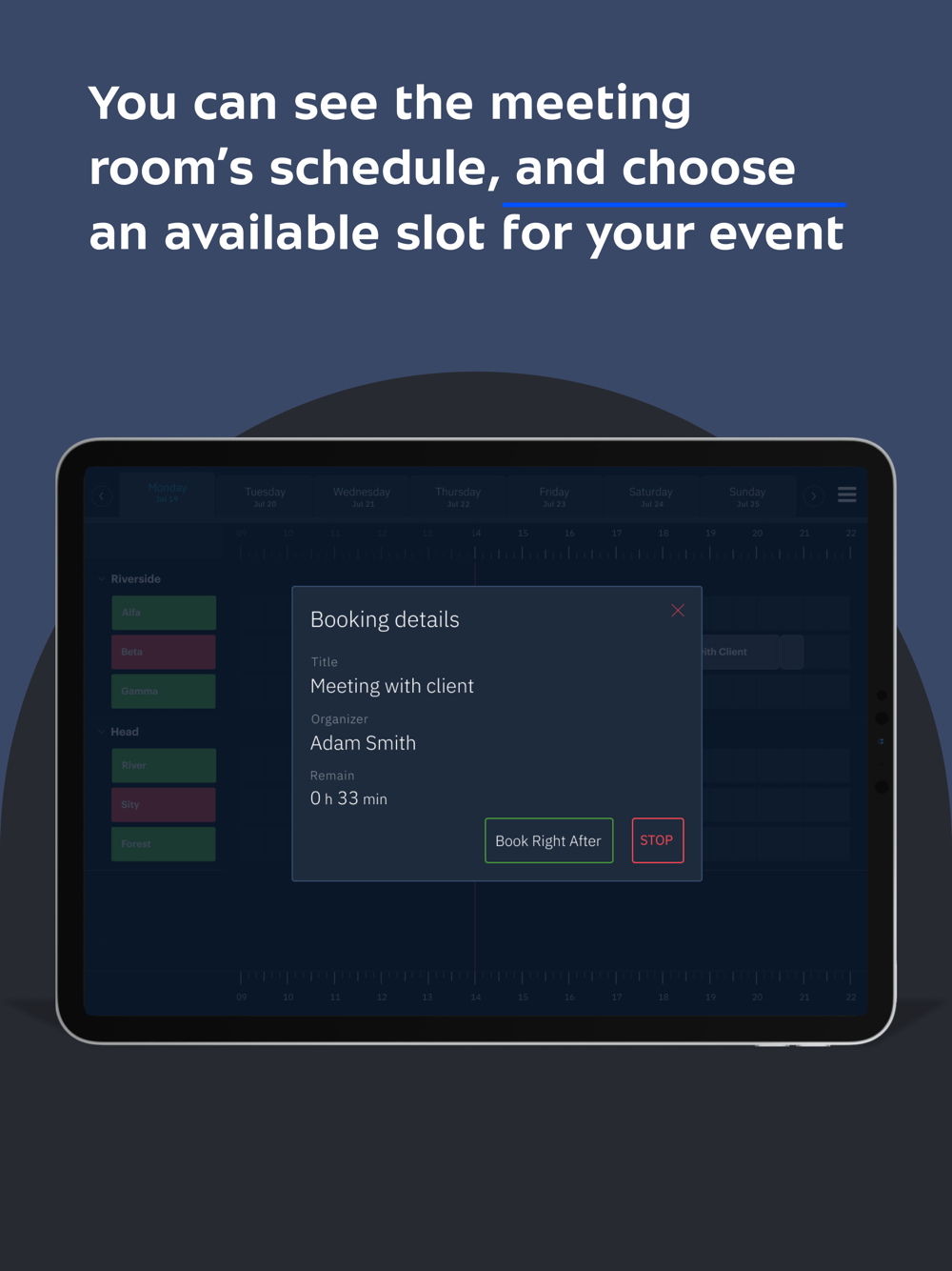 - Ability to book a meeting room from an office iPad deviсe, your personal mobile or web applications.