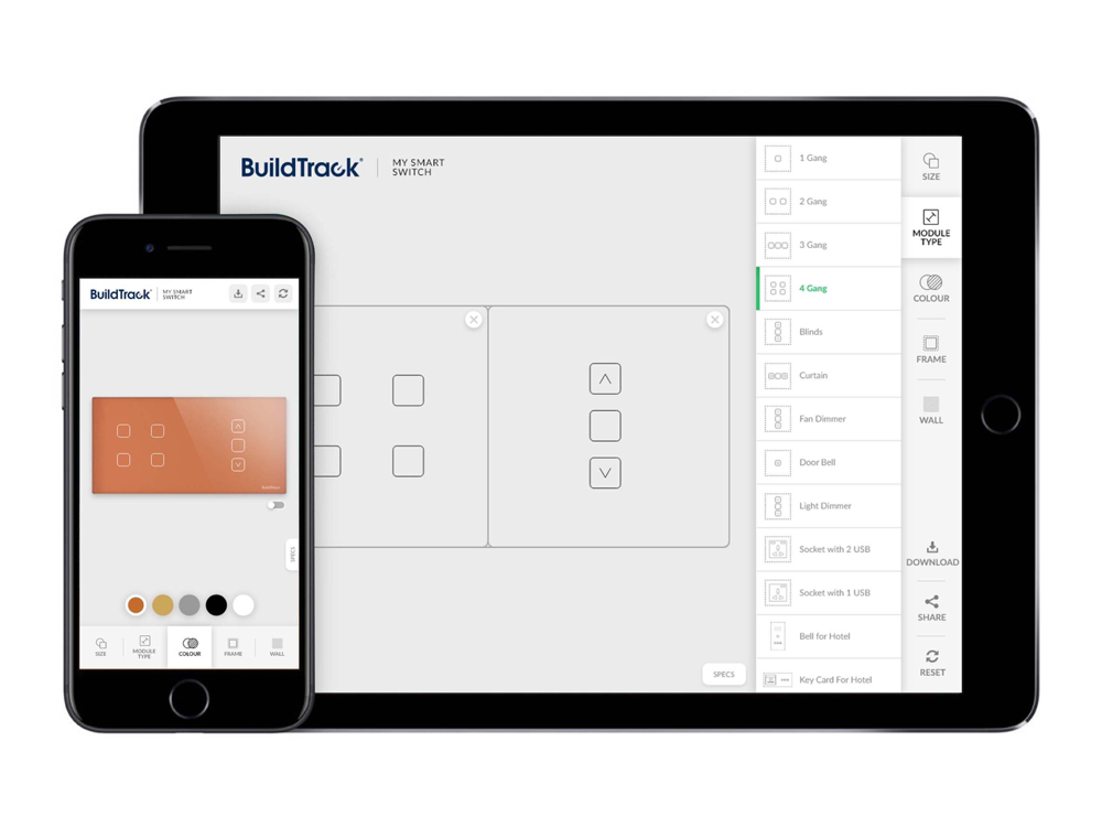 This App enables Architects, Interior Designers and Customers to ‘Build their Switch’ by using the aesthetic and functional combinations provided by the BuildTrack Smart Touch Switch. The chosen switch can be arrayed against various background colors or images from the image gallery or camera. Once a switch is created on the App, it can be shared with others and retained for placing orders with BuildTrack.
