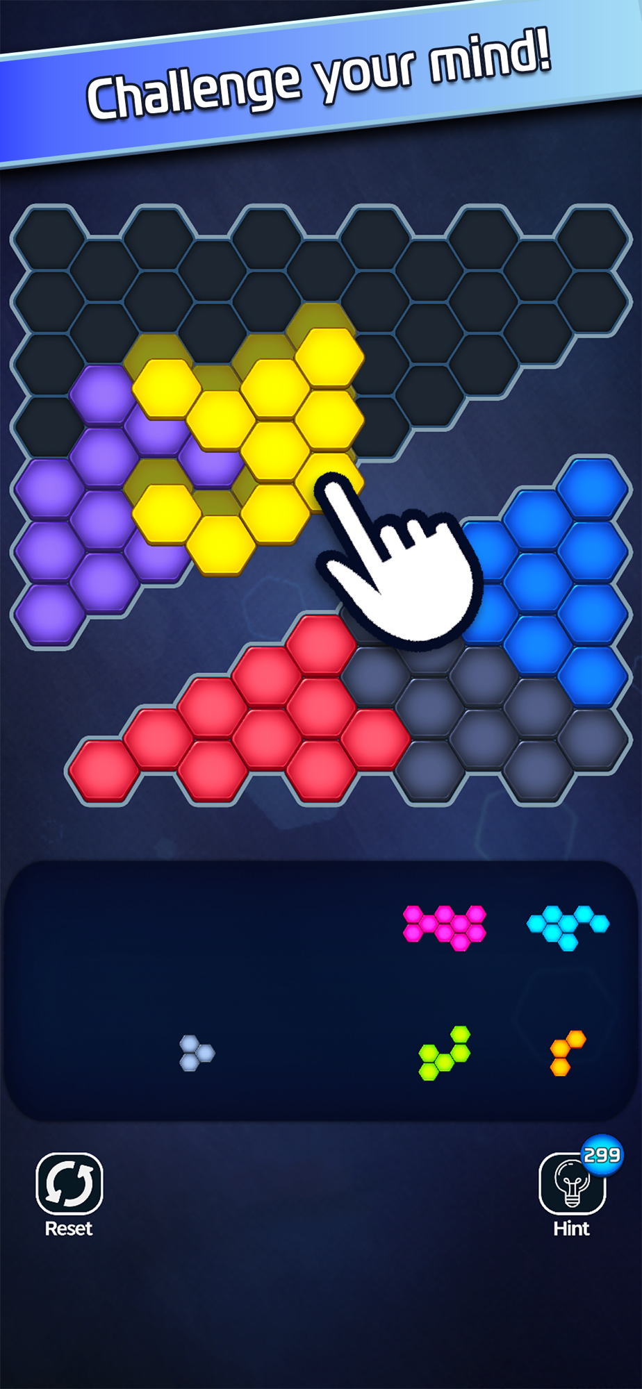 Only the best can solve them all! Put your puzzle solving skills to the test by placing the unique hexagon pieces neatly into the puzzle grid. Stretch your mind and train your brain with this fun and addictive puzzle game.