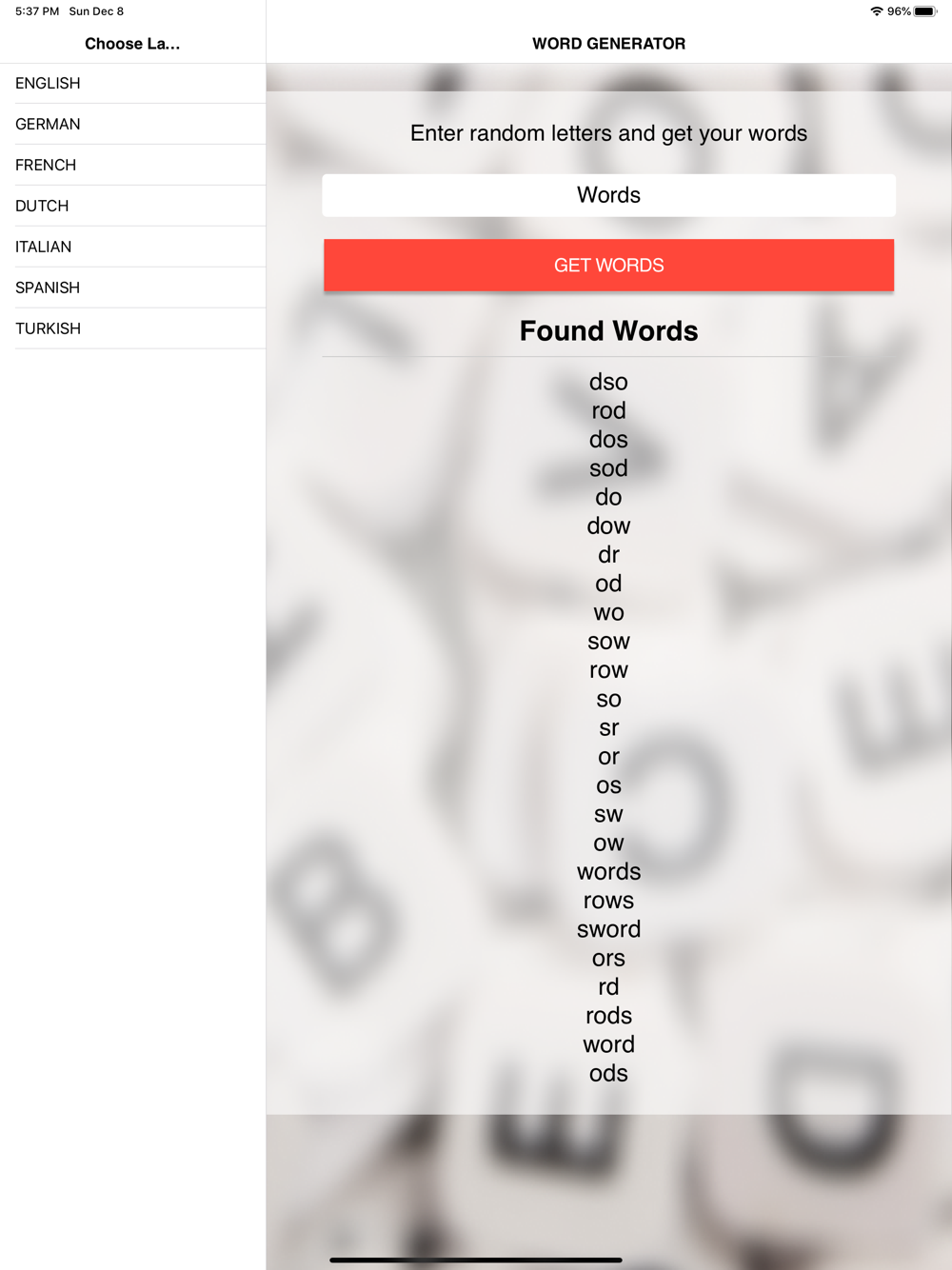 You have letters in mind and you don't know which words you can do? Are you playing the word game and want to quickly produce different words? Is it your goal to discover new words and improve your vocabulary? So our Word Generator application is just for you. Enter your letters and find out all the possibilities with "Word Generator for Games".