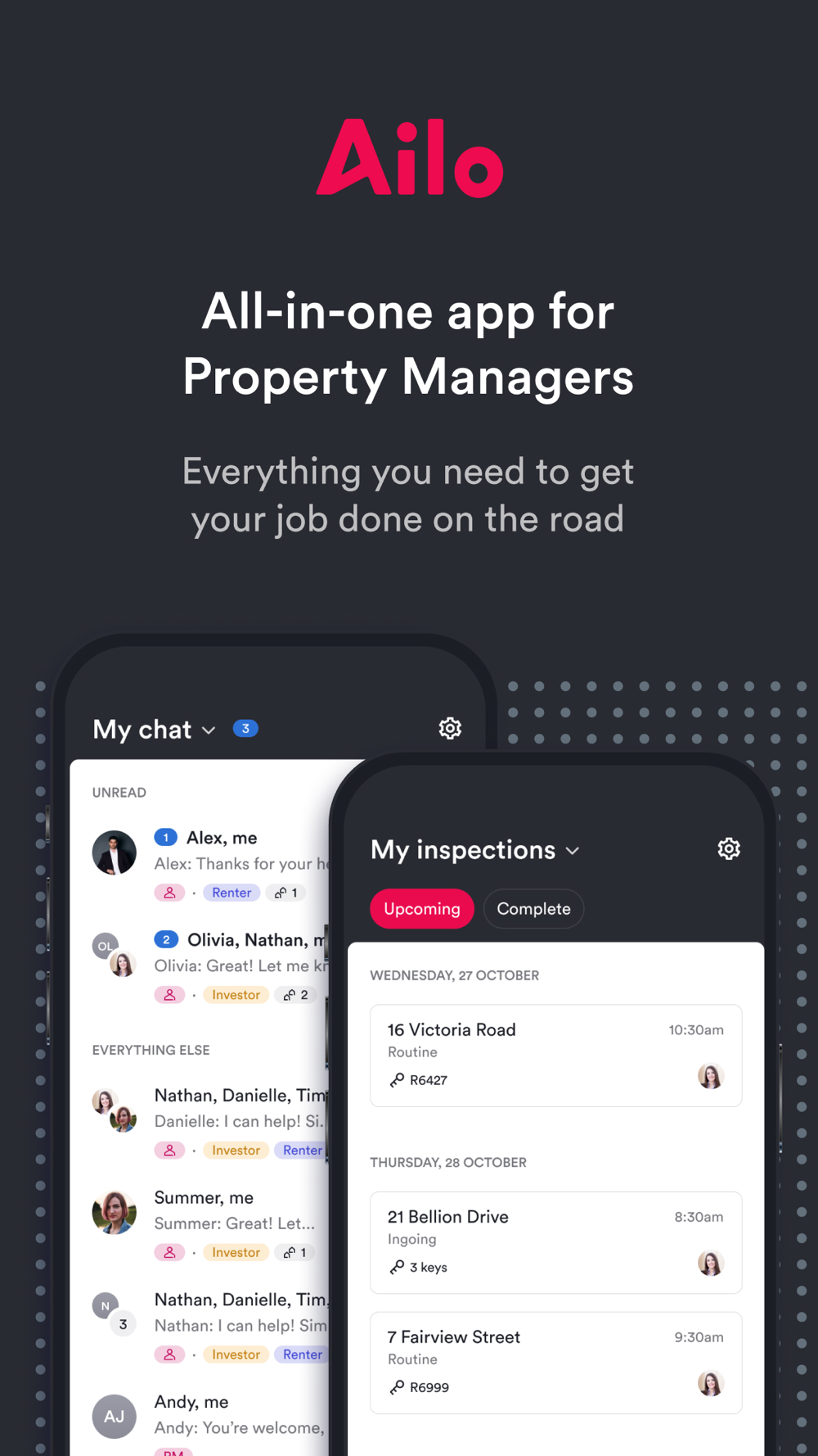 Ailo for Property Managers helps you manage your rent roll on the road. Conduct inspections and chat with your customers from anywhere, anytime. Get your inspections done quickly with 5x faster image uploads vs. our previous app (depending on your device and internet connection). You can also complete inspections as a team on multiple devices simultaneously. Ailo's chat breaks your conversations into easy-to-follow threads, so you can stop wasting time digging around in emails or old text messages. With message notifications, the ability to mark-as-unread, and access for the whole team - you'll never skip a beat. Whether you're sat at your desk or standing in-line for a coffee, the Ailo for Property Managers app is the perfect mobile companion to help you save time and stay productive. To use the Ailo for Property Managers app, you need to be an Ailo agency user. Visit https://ailo.io for more information.