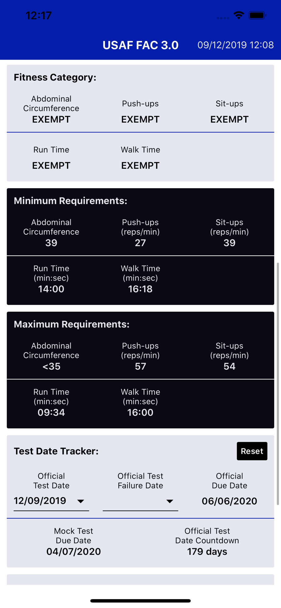 This app is the most efficient & practical way to calculate your score, track your results, next official test date, mock test date (60 days out), & share all of the above via your favorite social media apps. All parameters are based upon the official USAF guidance IAW AFI 36-2905, Fitness Program (latest version), & is accessible in a PDF file at the bottom of the app (Fitness Program Charts Guidance). The USAF FAC provides all of your minimum and maximum performance standards, etc. and precisely calculates your USAF PT test assessment scores for all unique assessments & highlights your threat categories respectively.