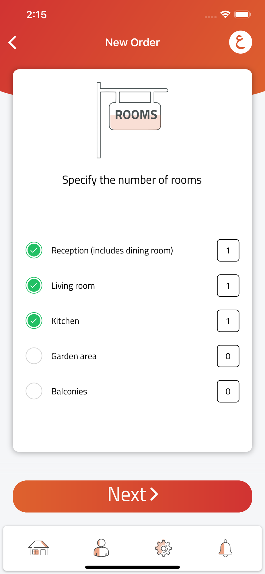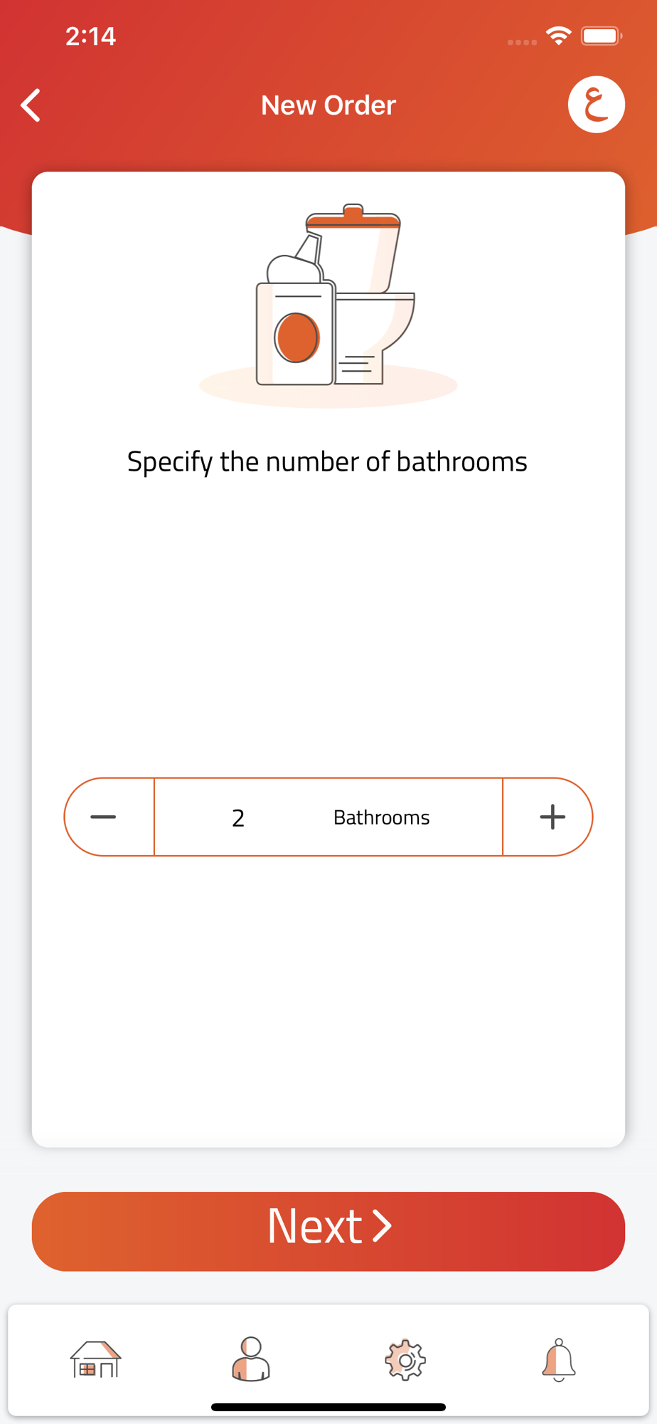 • Open the Tandeefa app on your phone and select the number of rooms and bathrooms you have.