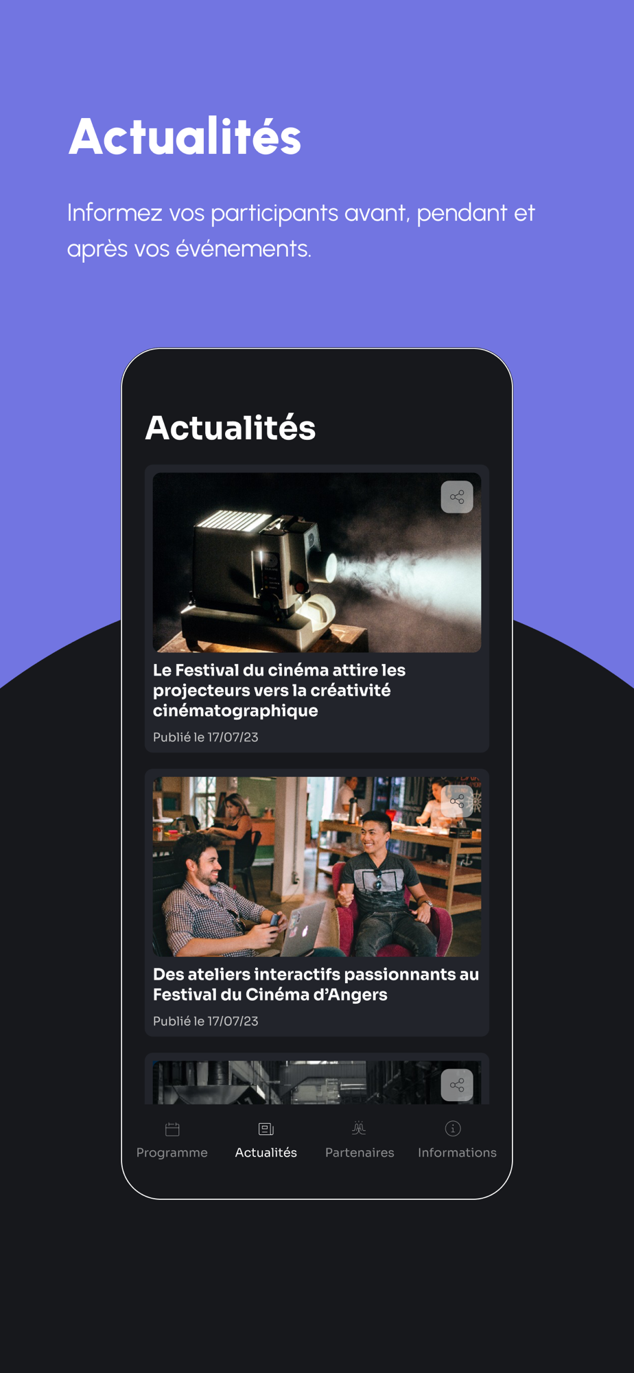 Votre événement est disponible à partir d'un code que vous partagez à vos participants. Vous pouvez gérer et éditer le contenu de l'application pour la personnaliser et proposer un outil pratique avant et pendant votre événement.