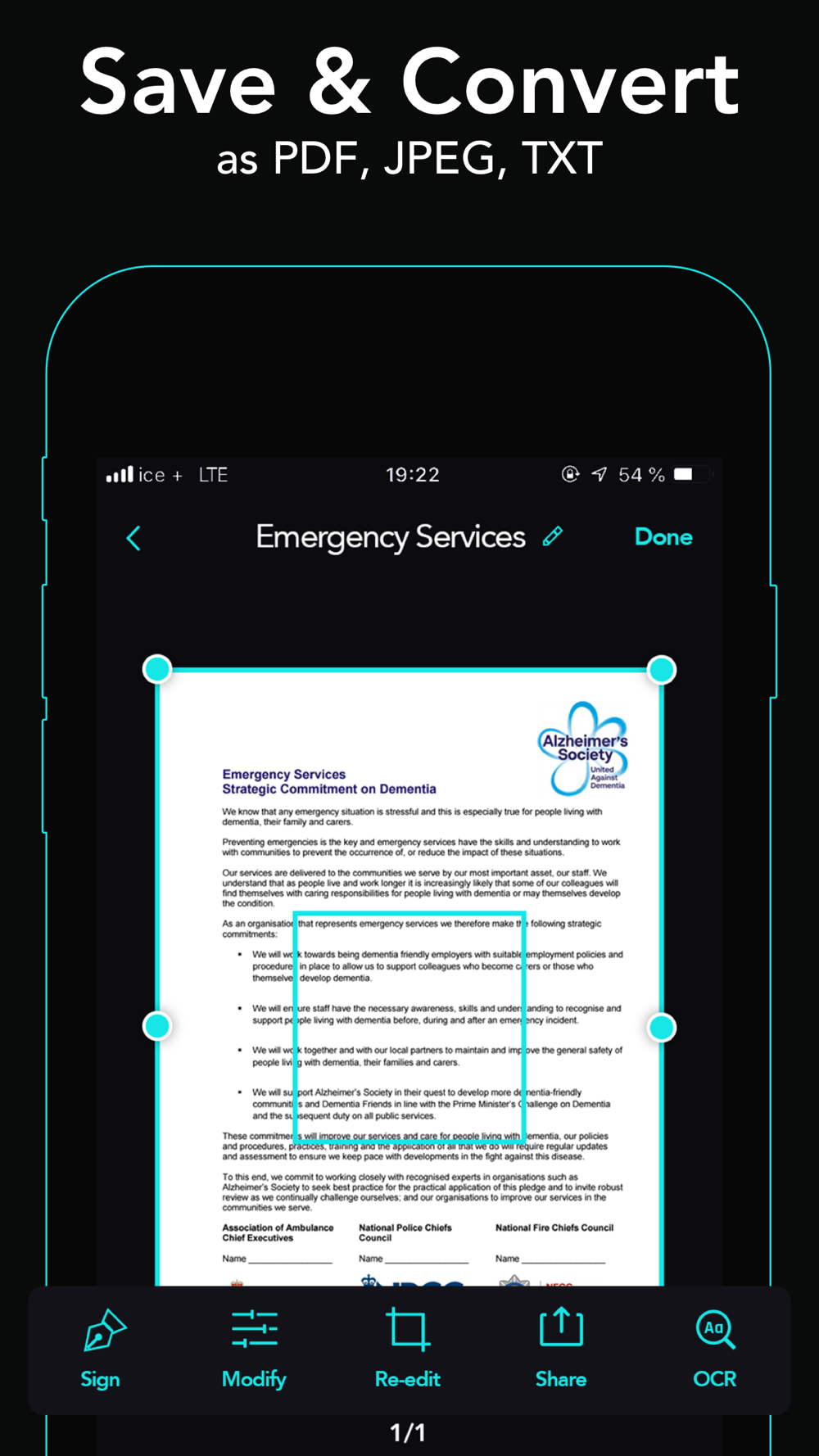 OCR (optical character recognition) feature extracts texts from single page for further editing or sharing. (Paid app only)