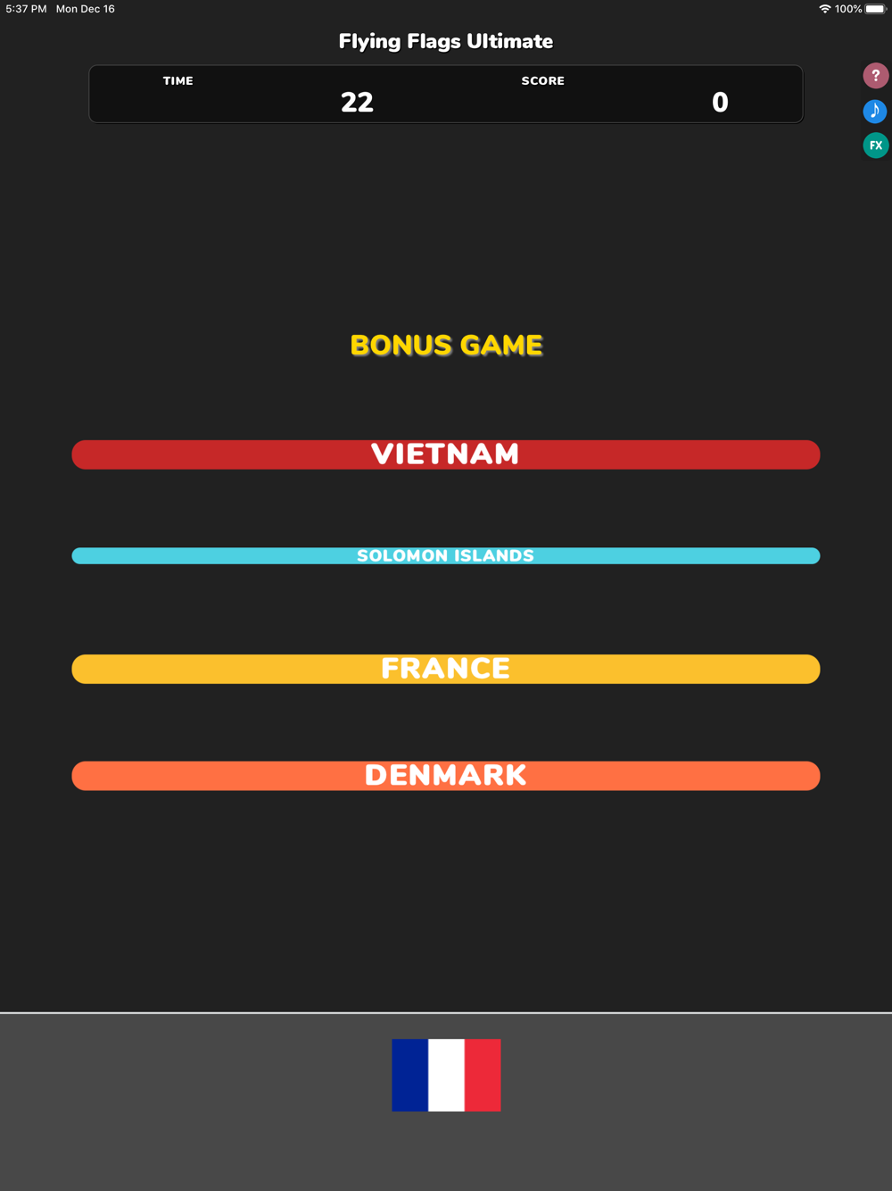 There is a carefully designed learning process at the core of the game. You will recognize, and retain in your memory, the national flags of almost all the countries in the world through repetition, disambiguation and progressive difficulty. And this all happens within the challenging and enjoyable context of an action game.