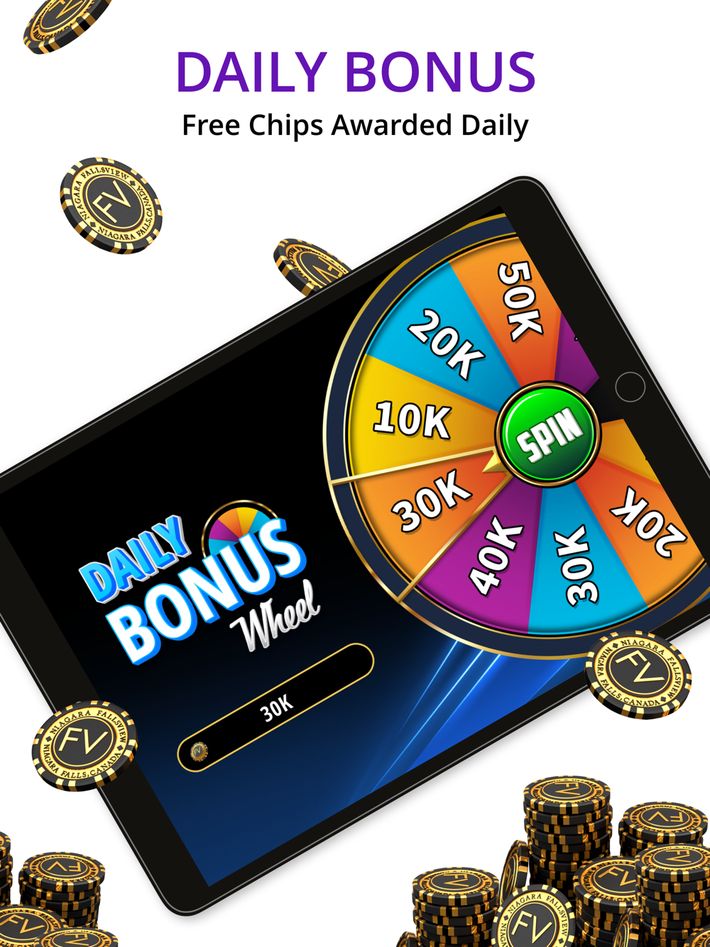 Must be 19 years of age or older to participate on the FallsviewSocial gaming app. Customers who are self-excluded are not permitted to sign up or participate. This app cannot be played for real money. Offer of 2 million bonus chips valid for new sign ups only and accounts must be registered. Bonus chips are virtual chips that can be played on the social gaming app only. Offer valid for named recipient only. Offer is non-transferrable, non-negotiable and has no cash value. Offer may be modified or cancelled at any time without notice. Void where prohibited