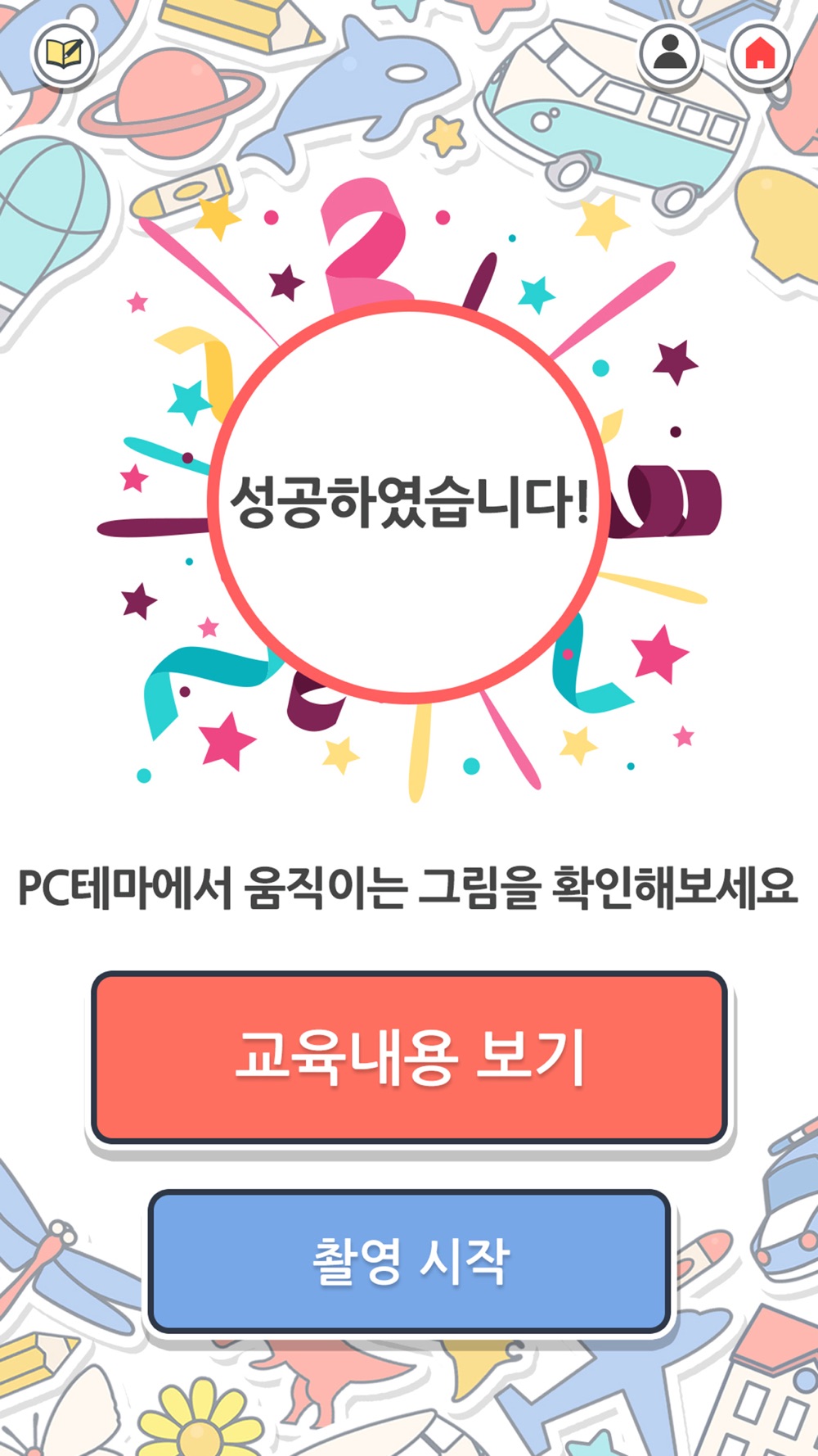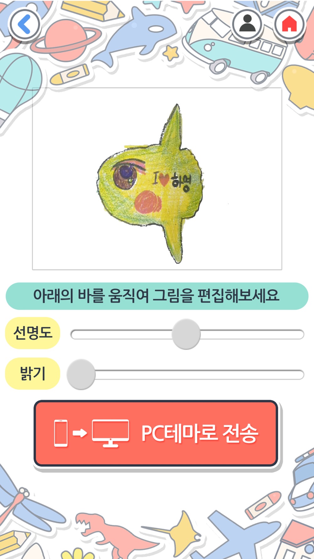 그리기 전용지를 완성했다면 카메라 APP으로 촬영하여 그림을 PC테마에 전송해 주세요! 고화질의 이미지와 함께 알찬 교육내용도 준비되어 있습니다.