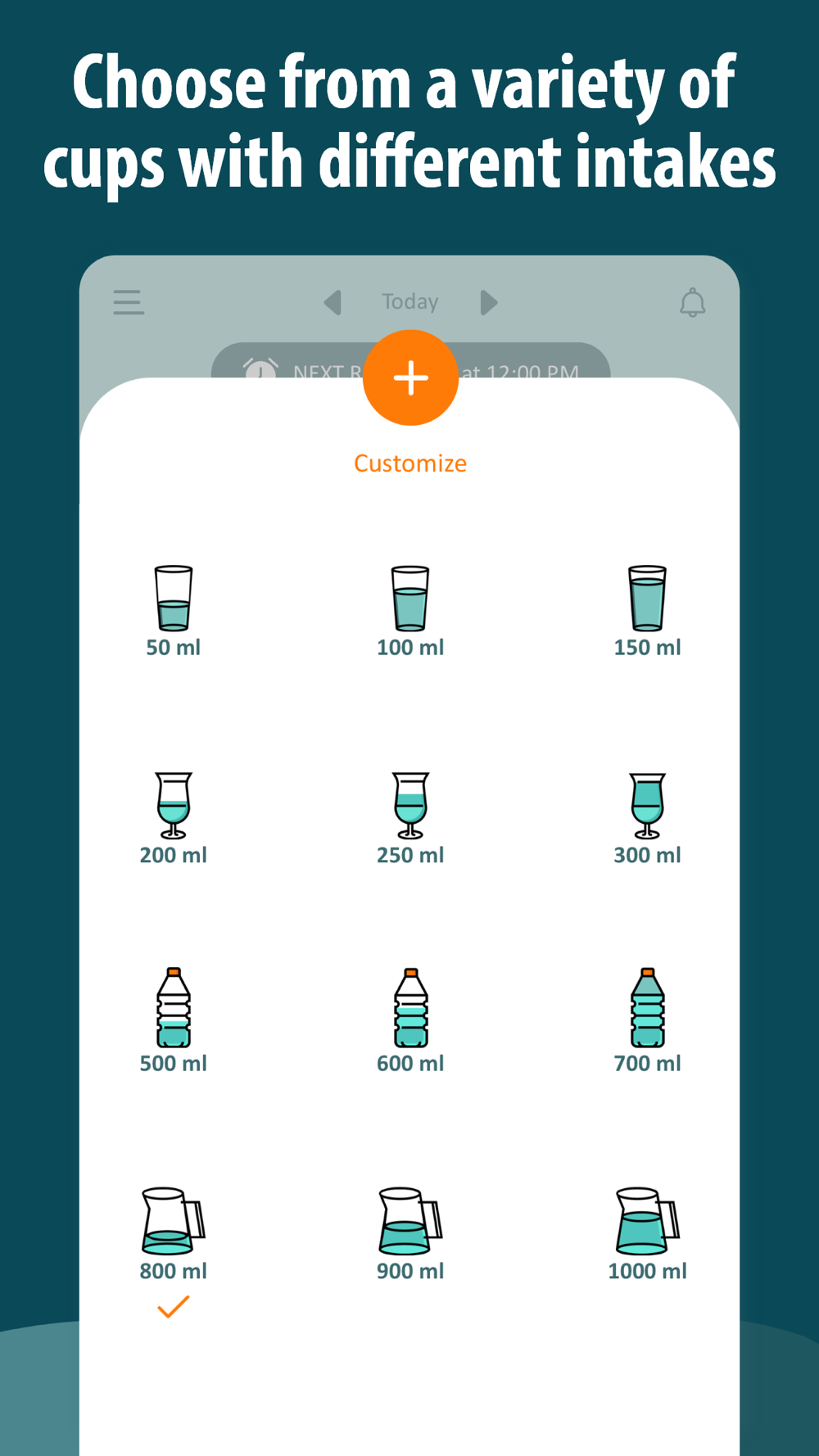 - Choose the amount of water you intake from 12 different pre-defined containers