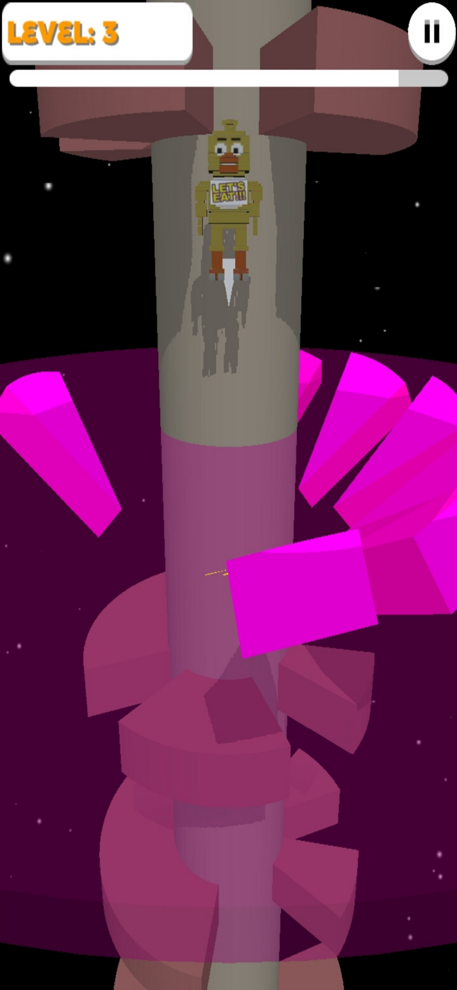 Helix Freddy Jumpy is an exciting endless arcade game in which you touch on left screen to spin the pillar left, touch on right screen and hold to spin the pillar right. Try to fall through the cracks and avoid the dead pieces. Be careful of the time, you need to go through all the pieces as quick as possible.