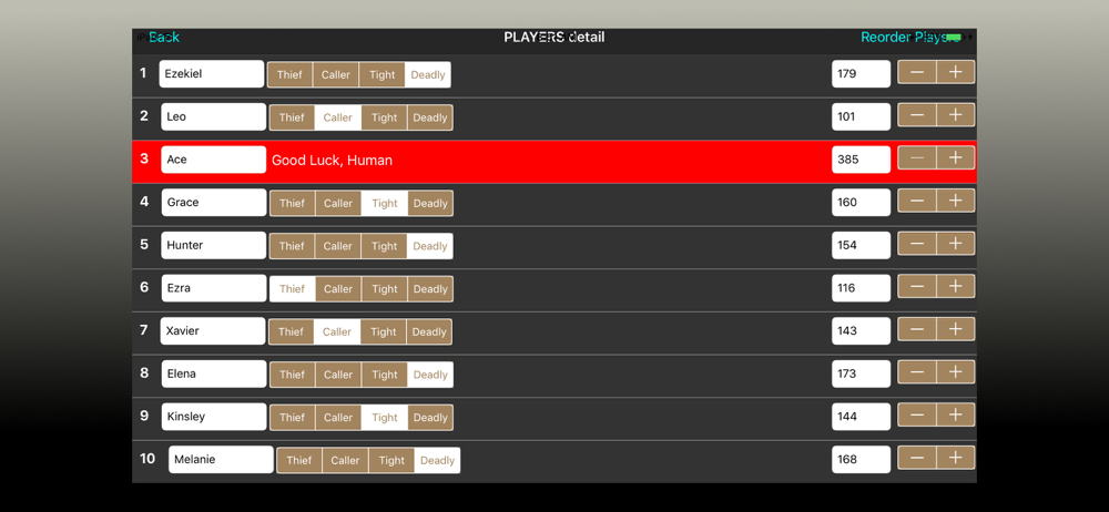 - Tournament (knock-out) or Ring (AI buys back in) game play