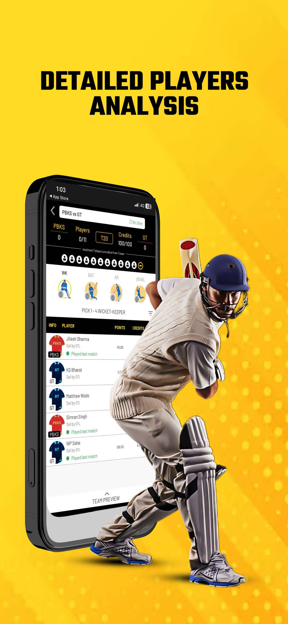 Create your fantasy cricket team by choosing real players from the match