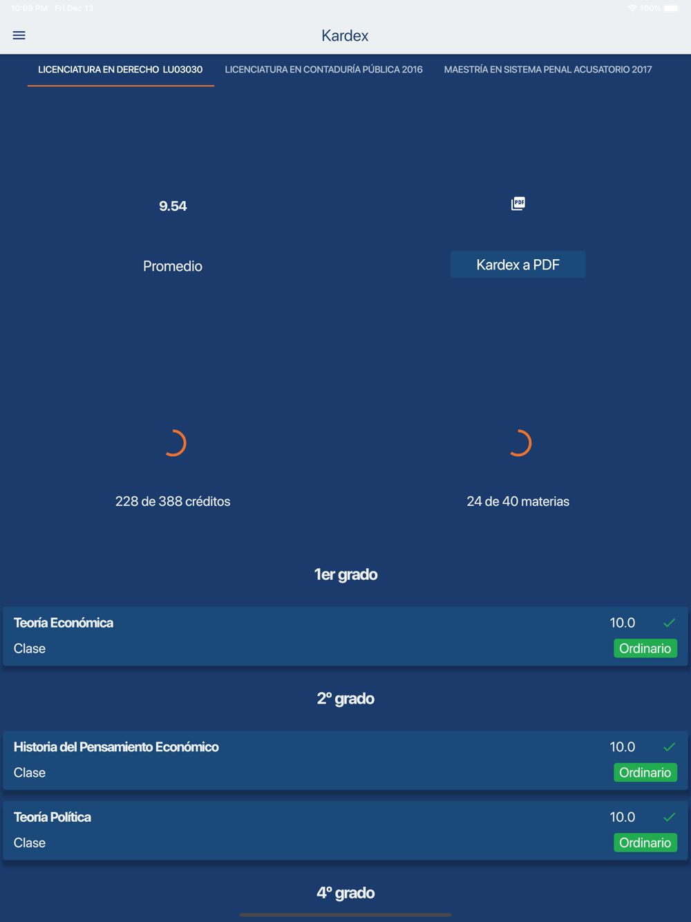 Kardex: Poder visualizar los kardex que tienes registrados con nosotros, las materias concentradas en cada uno, el porcentaje de avance, descarga en formato PDF, consulta de detalles de cada materia registrada.