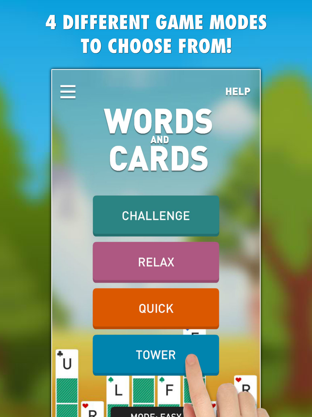 Words & Cards has original gameplay, 4 different game modes (Challenge, Relax, Quick, Tower), 3 difficulties to choose from, over 500 000 English words and 12 different leaderboards in which you can compare your score with points of other people from all around the world!