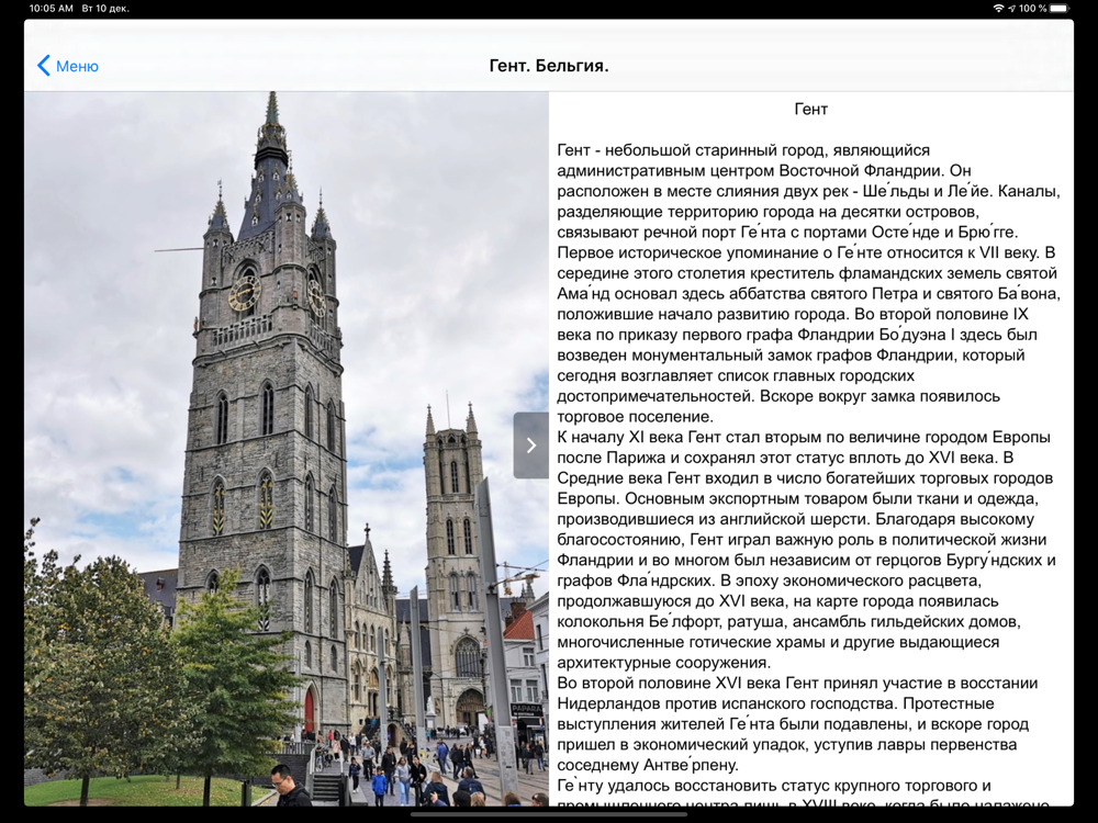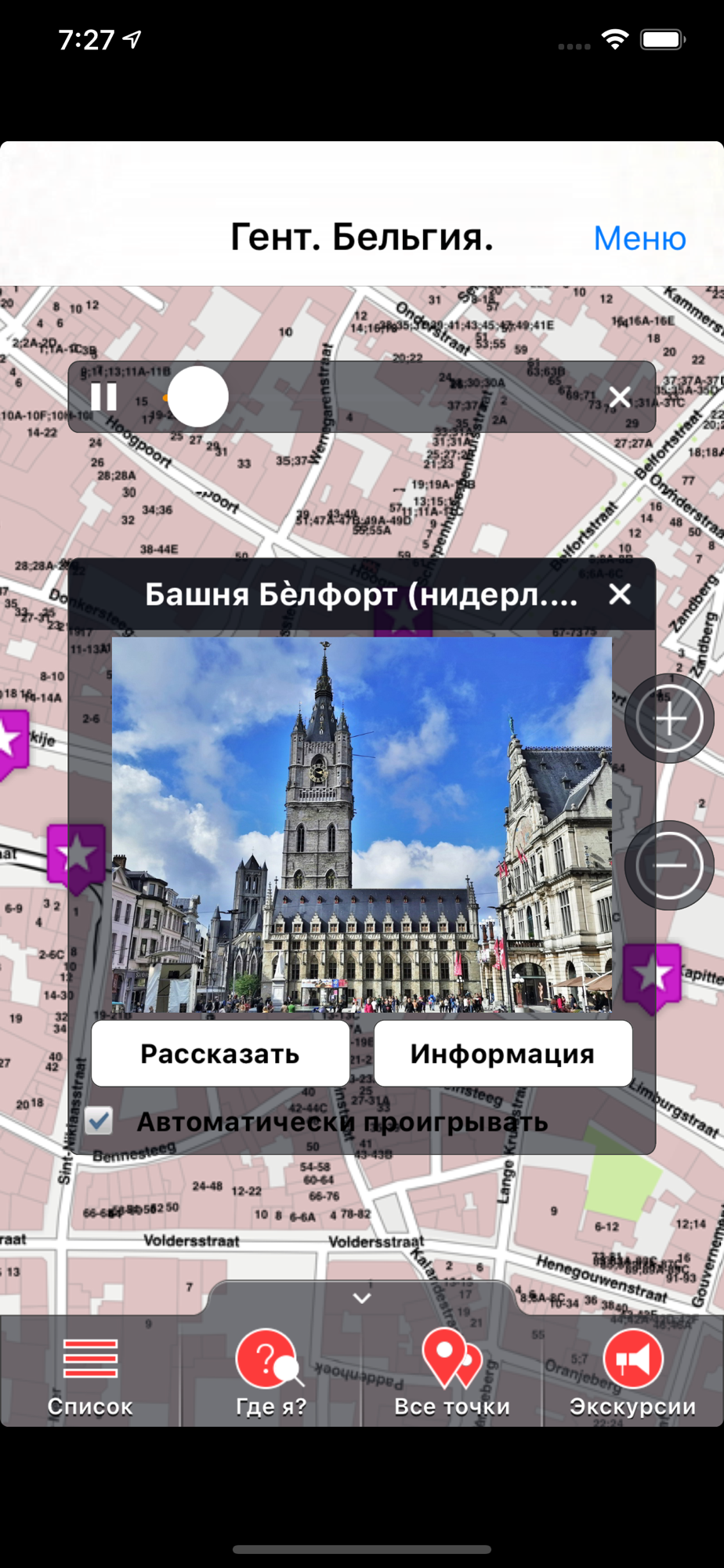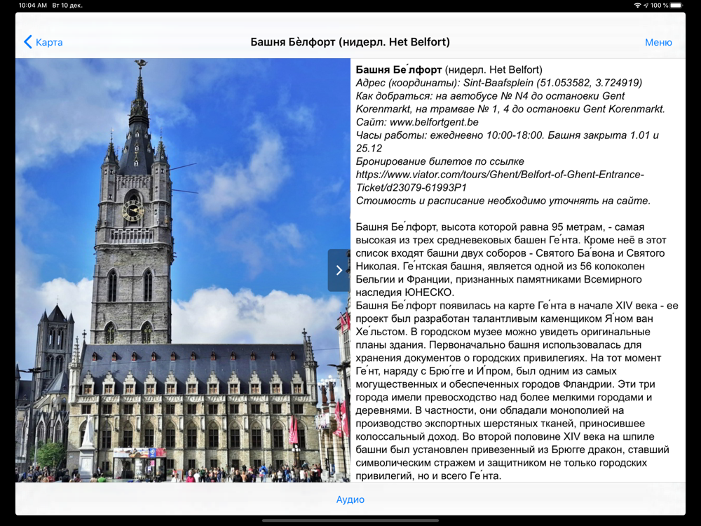 ● АУДИОГИД ПО ГЕНТУ. Рассказы аудиогида озвучены профессиональным диктором. Слушайте рассказы, не отвлекаясь от осмотра достопримечательностей и не теряя время. Не стоит лишний раз портить зрение, читая на ходу текст на небольшом экране.