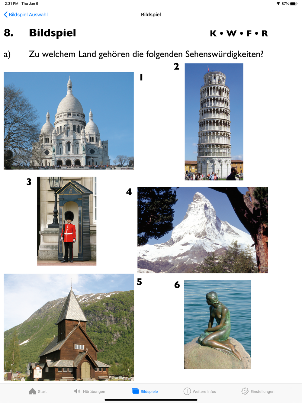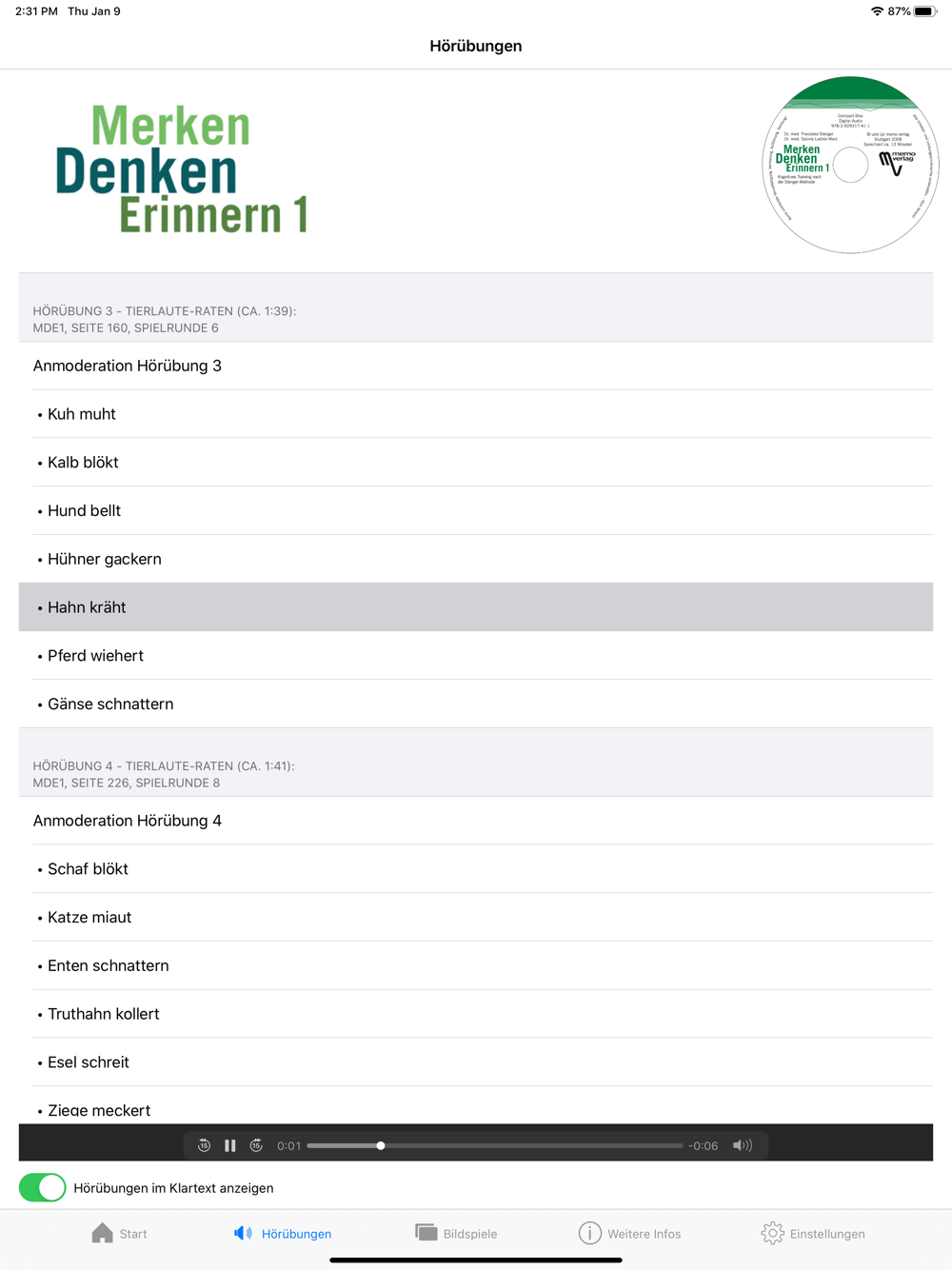 Die App enthält 4 Hörübungen, wie z.B. Tierlaute-Raten oder Lieder-Raten sowie 5 Bildspiele.