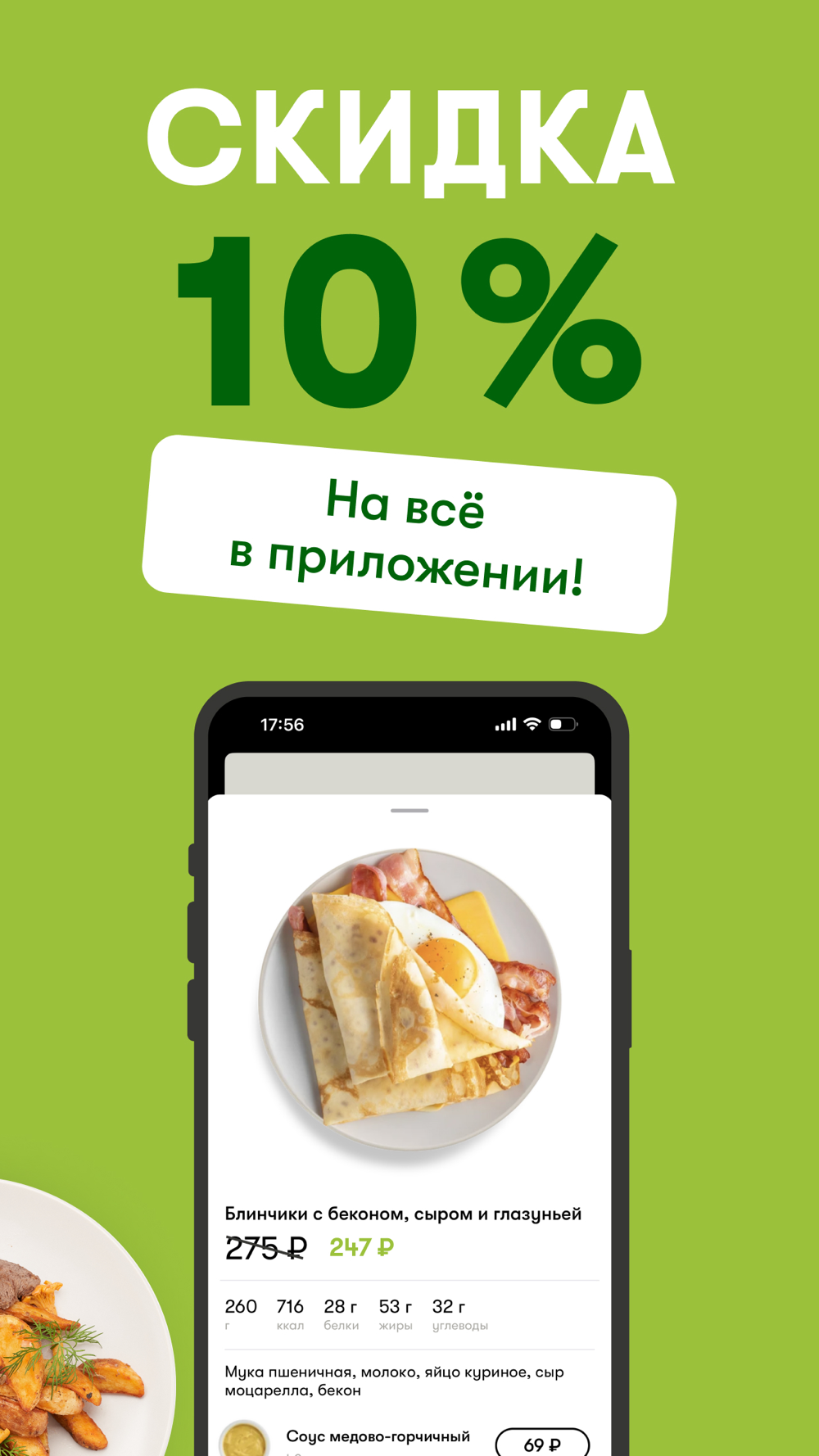 Скидка 10% на всё в приложении! Горячая еда для всех: готовим завтраки, обеды и ужины.