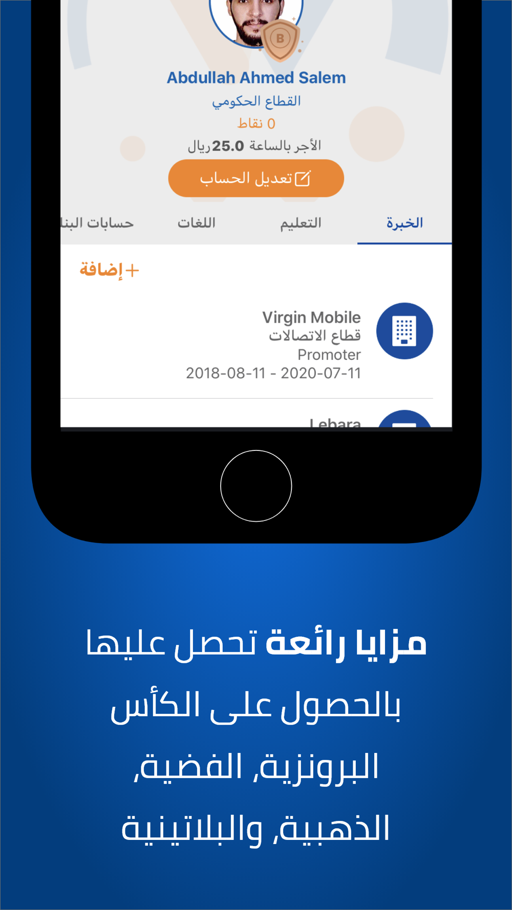 بعد إنشاء الحساب ، أكمل ملفك الشخصي بإضافة معلومات إضافية مثل (رقم الهوية ، المدينة ، المنطقة ، الجنسية ، تاريخ الميلاد.والمهارات) لمساعدة الشركات على الوصول لك بشكل أسرع.