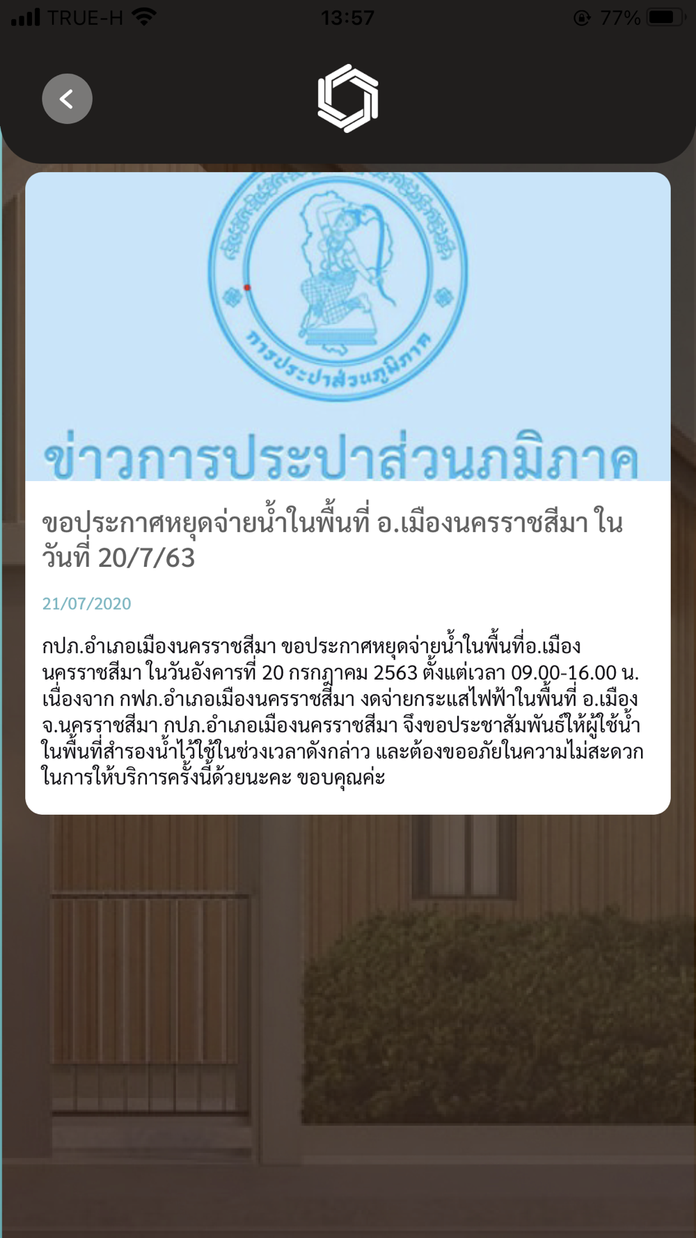 แอปพลิเคชันสำหรับผู้อยู่อาศัยภายในโครงการ ที่จะคอยช่วยอำนวยความในด้านต่าง ๆ ให้แก่คุณ ทั้งการตรวจเช็ครายการบิลค้างชำระ แจ้งเตือน ข่าวสารใหม่ ๆ ของโครงการ เป็นต้น