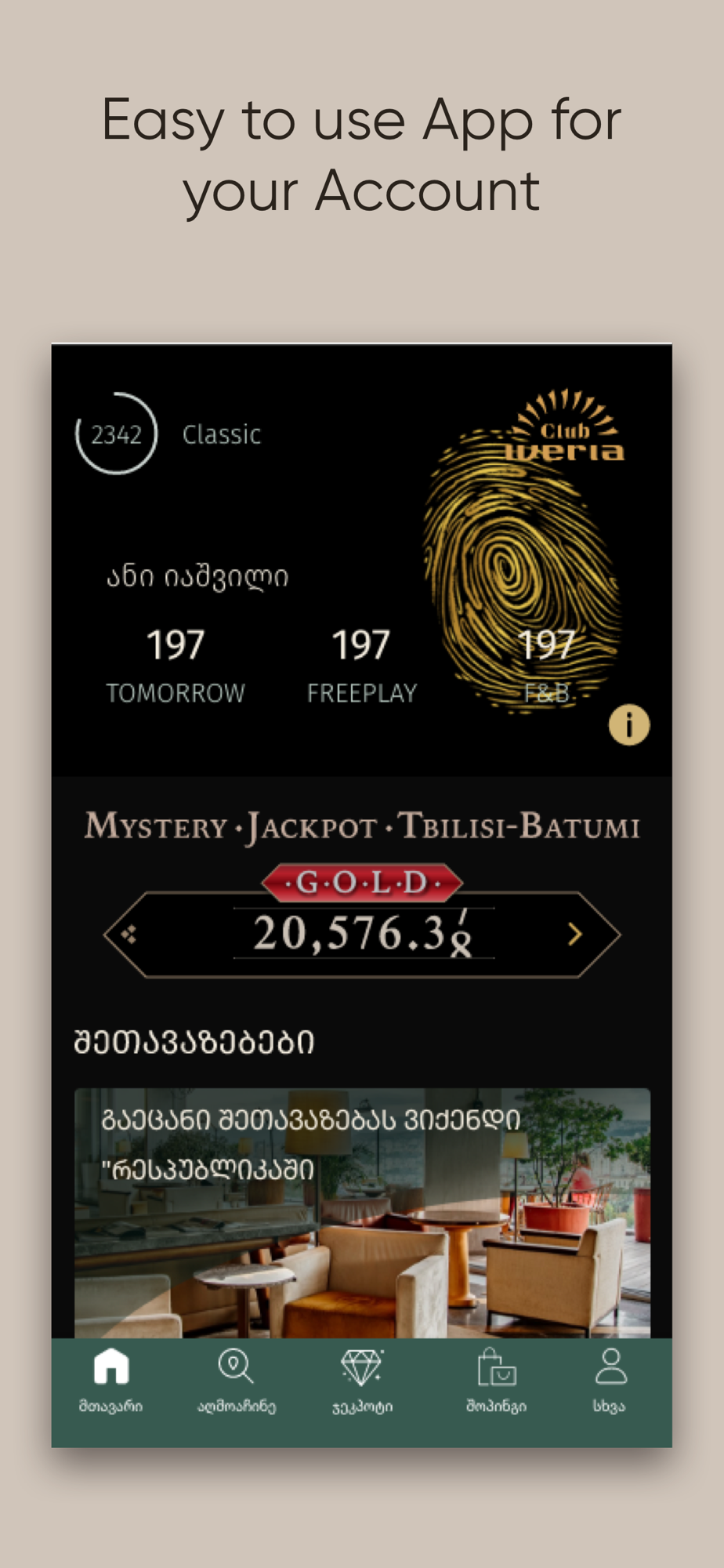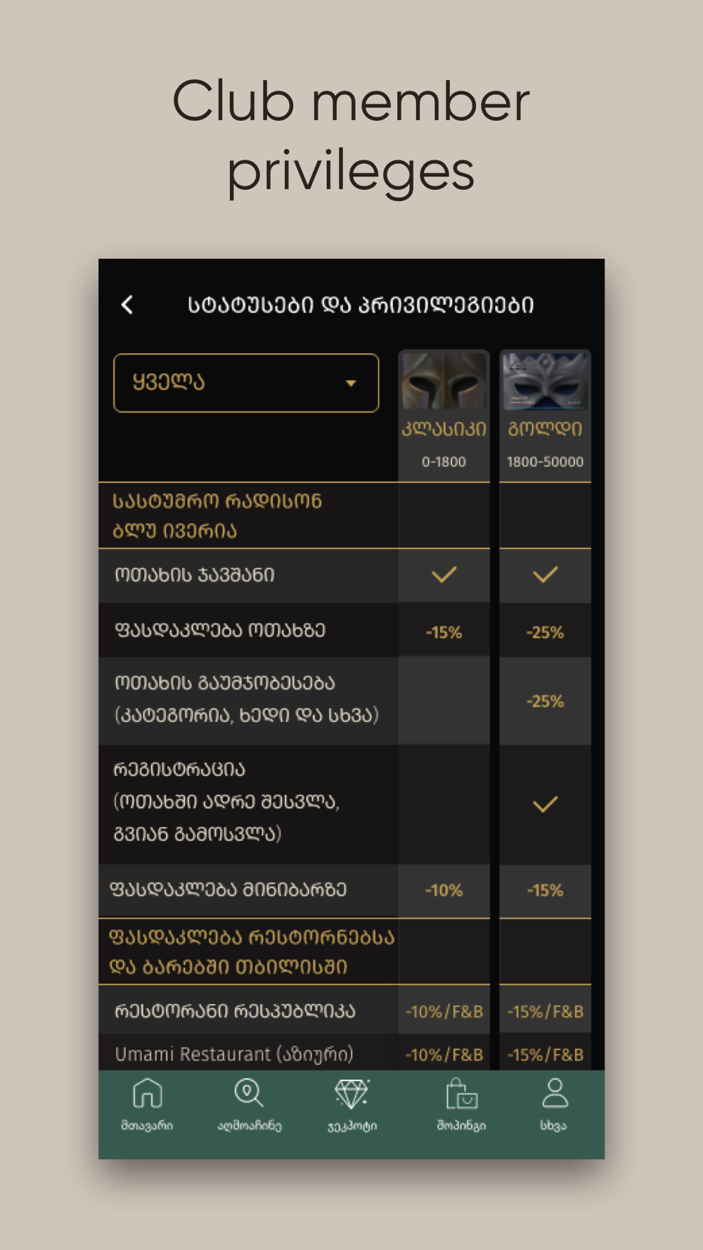 Experience the privilege by becoming Club Iveria App user. Download our application and enjoy the benefit of receiving exclusive offers, making online reservations easily, controlling earning and expenditure process of your points to name a few.