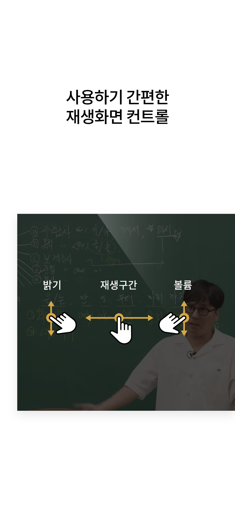 상하/좌우 제스처만으로도 재생화면의 밝기, 볼륨, 구간이동이 조절됩니다.