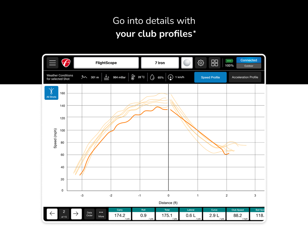 Record your sessions assisted by the FS Golf app on your Apple Watch. You can choose out of six different layouts to display selected parameters of recorded shots. Use your device to review shots and easily change clubs without stopping the session or reaching out for your smartphone. Our Apple Watch app also allows you to check the radar’s status so you will always know when it is ready for the next shot.
