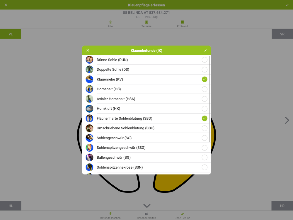 • Nachschlagewerk mit Bildern der Klauenbefunde und Erklärungen zu den weiteren Erfassungsmöglichkeiten