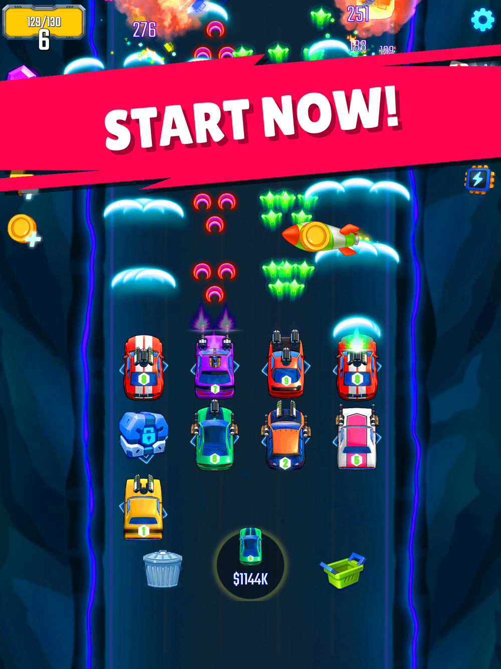 Start your car journey by simply clicking and and tapping to unlock new cars, merge them to upgrade and earn more money in this idle shooting battle.