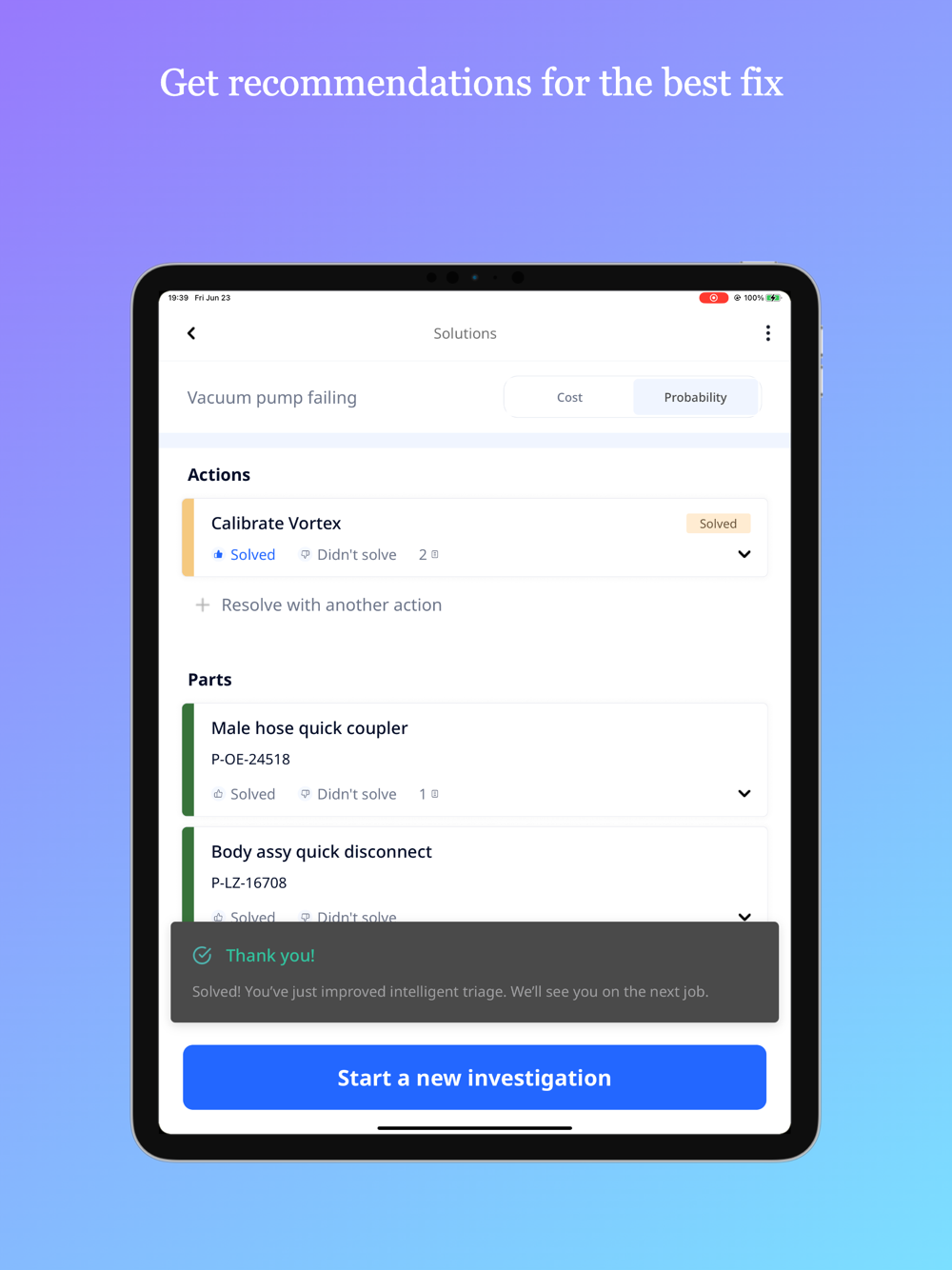 The most accurate diagnostics and troubleshooting tool driving low touch, high satisfaction service experiences. Quickly troubleshoot and triage even the most complicated equipment problems like an expert with Aquant's Service Co-Pilot. Start your investigation by entering the customer complaint into a short form. Service Co-Pilot then walks you through the diagnoses by asking the right follow-up questions based on your scenario. Because Service Co-Pilot is informed by real-world best practices, the system then leads you to the most likely solutions and identifies the most accurate parts needed. Quickly access relevant product information, documentation, wiring diagrams, and more to help you get the job done right. Escalate support to the right resource with additional visual guidance through built-in video calling and augmented reality illustrations. Service Co-Pilot continues to get smarter with use as it learns from each job. You can get to the root of the problem quickly and implement the best possible fix.