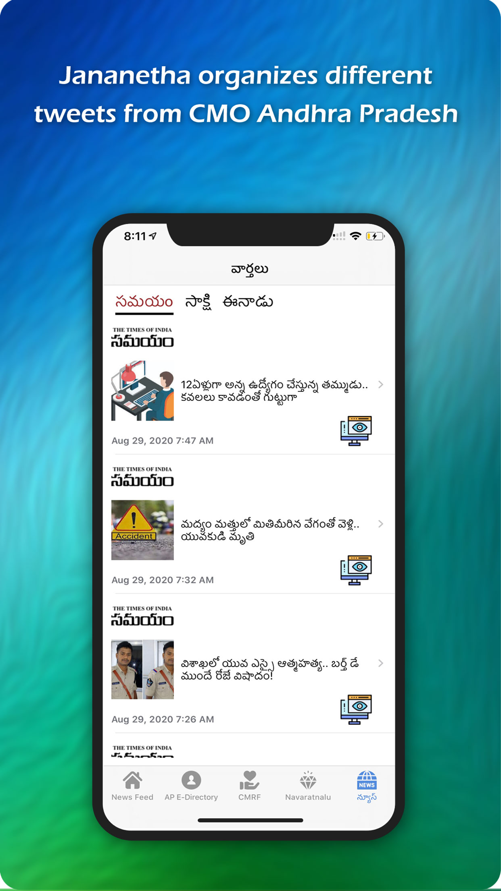 Day to day activities of honourable chief minister of Andhra Pradesh. Along with AP E-Directory which contains all contact details of higher officials in different government departments.Updated tweets of CMO Andhra Pradesh.CMRF donations etc.