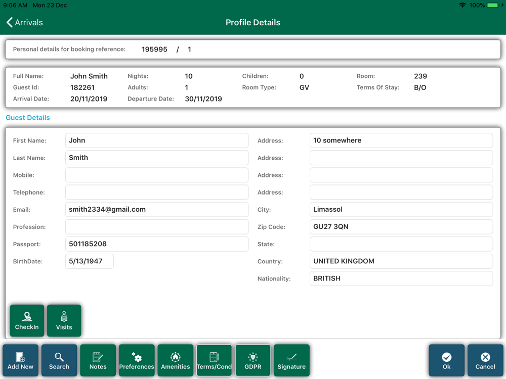 During the guest arrival the app allows for the collection of guest personal information as well as guest amenities, notes and preferences. Depending on the country and setup, online credit card payments can also be processed.