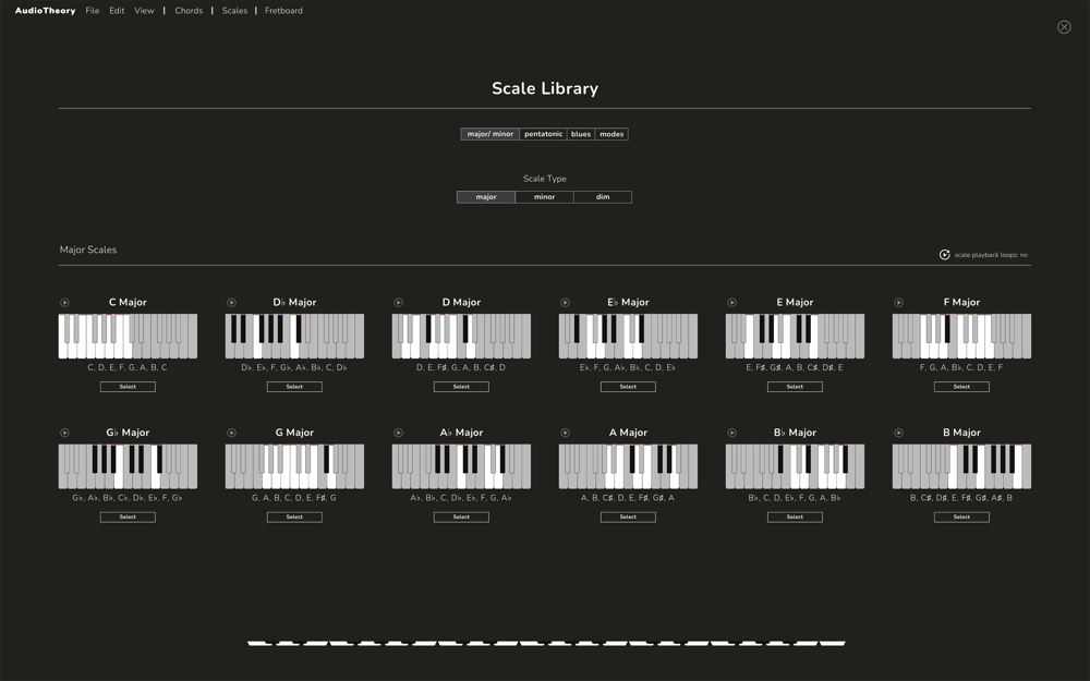 Exclude notes and never play out of key again. Your fretboard diagram now only shows the notes you need and your keyboard doesn't play the ones you don't.